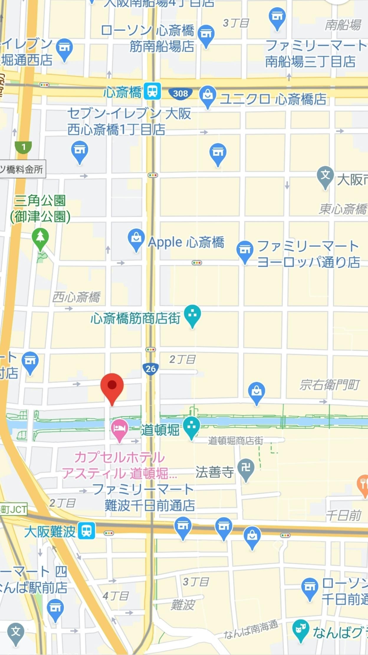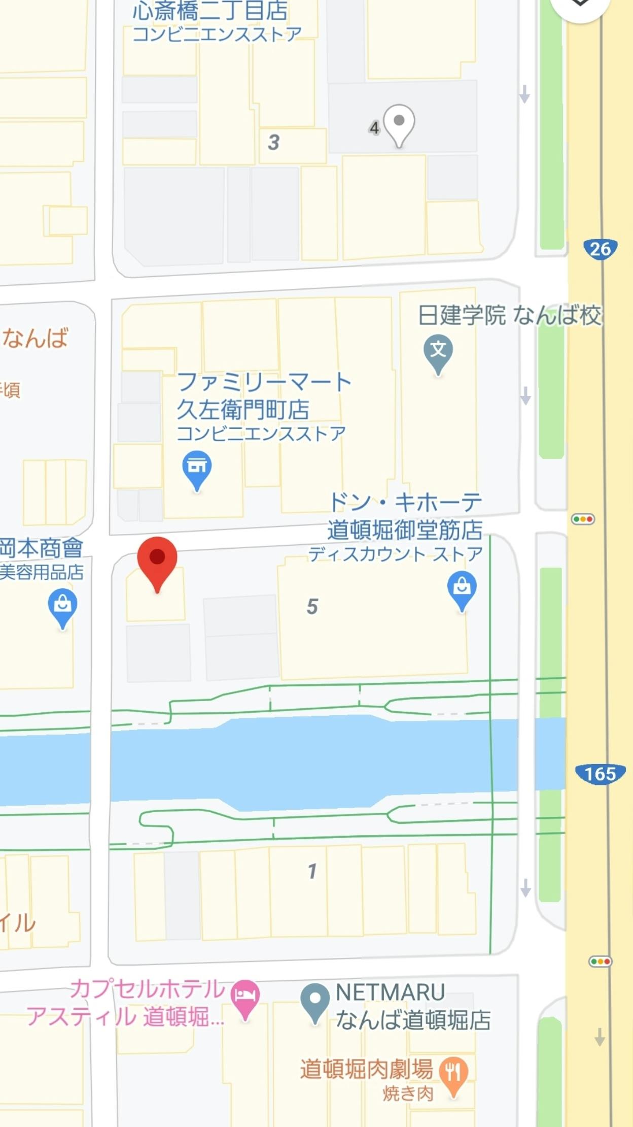 御堂筋線なんば駅25番出口より御堂筋を北へ向かい、橋を越えてドン・キホーテ道頓堀御堂筋店をすぐ左へ曲がり、ファミリーマートがある四つ角の左にある1Fに飲食店がある茶色いレンガ貼りのビルの2Fです。