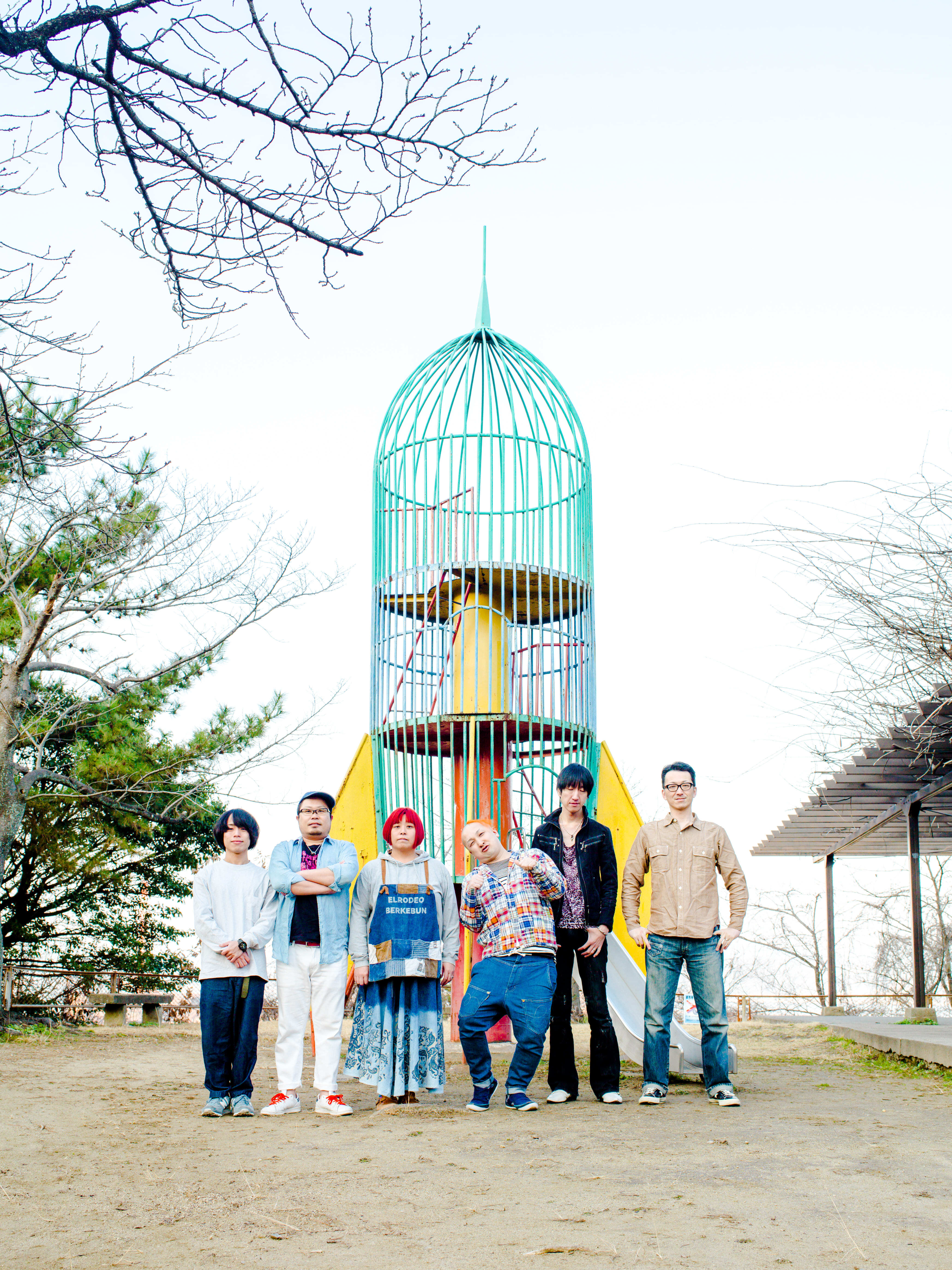 左から→Dr:みかみひさし Perc:御堂河内誠 Vo/Cho:bubbles Vo/Gt:橘新二 Gt:TAKEKAZU Ba:臺和樹