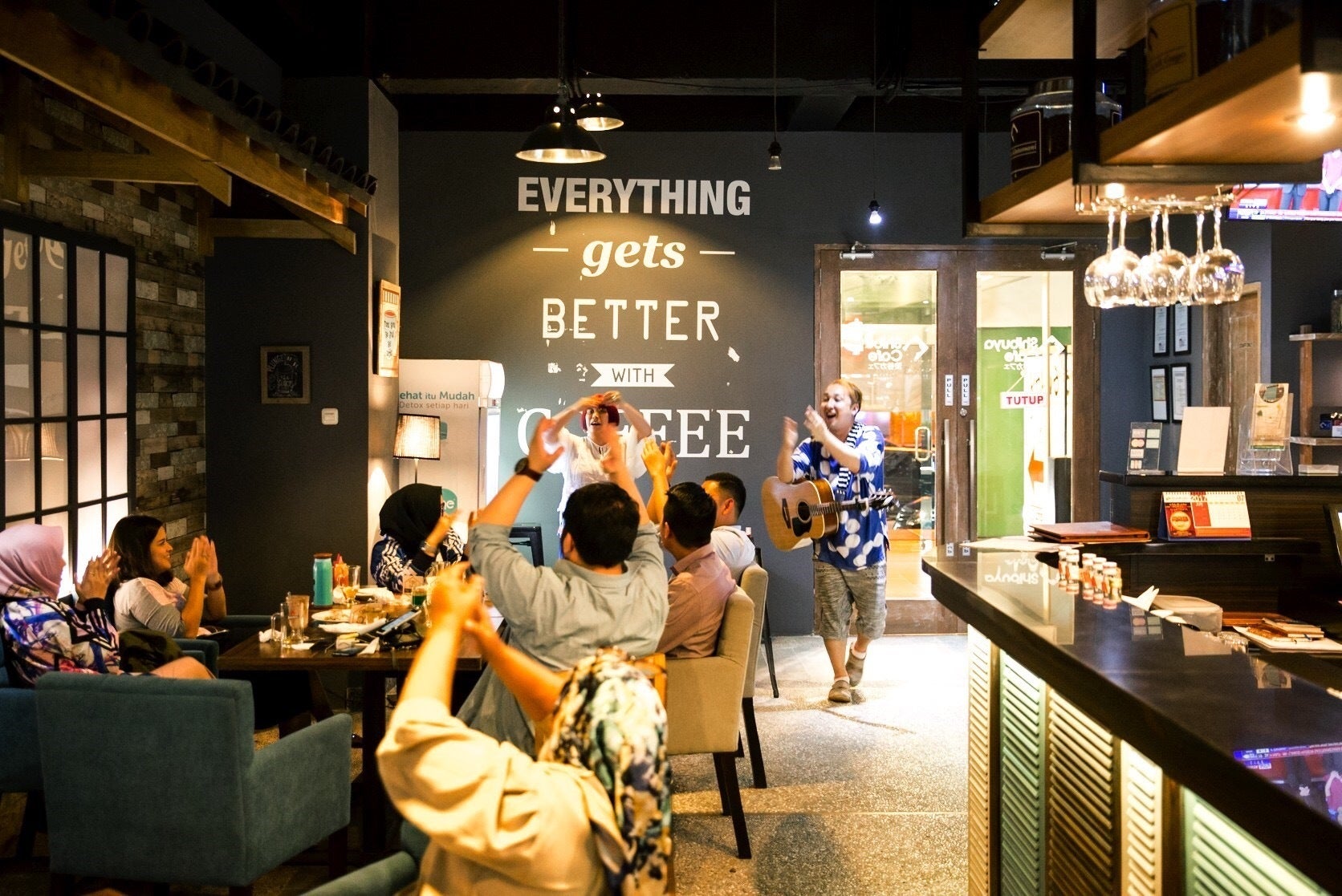 ジャカルタにてワークショップなども手掛け、ライブも各所で演奏。※ジャカルタのカフェでのライブ風景