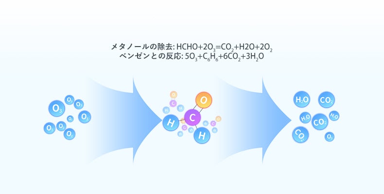 また、オゾンはホルムアルデヒドなどと酸化反応を起こすと水分子や微量の二酸化炭素