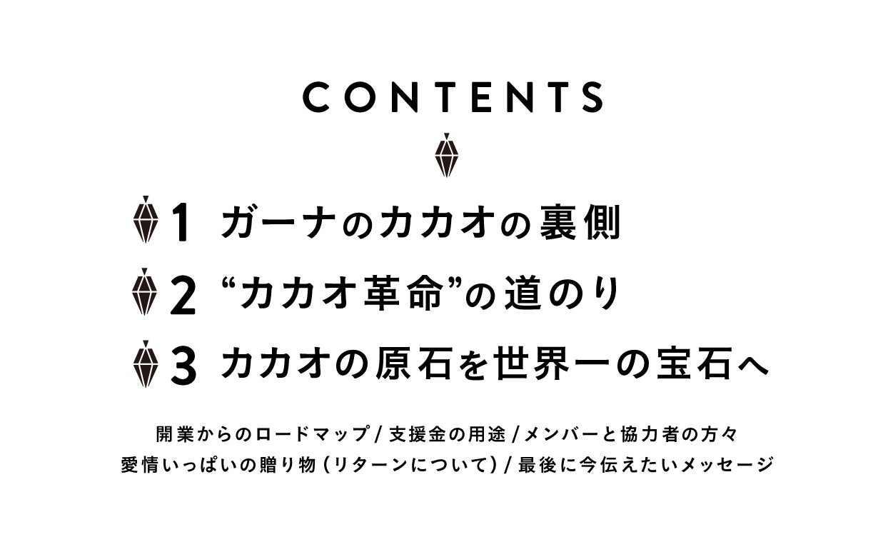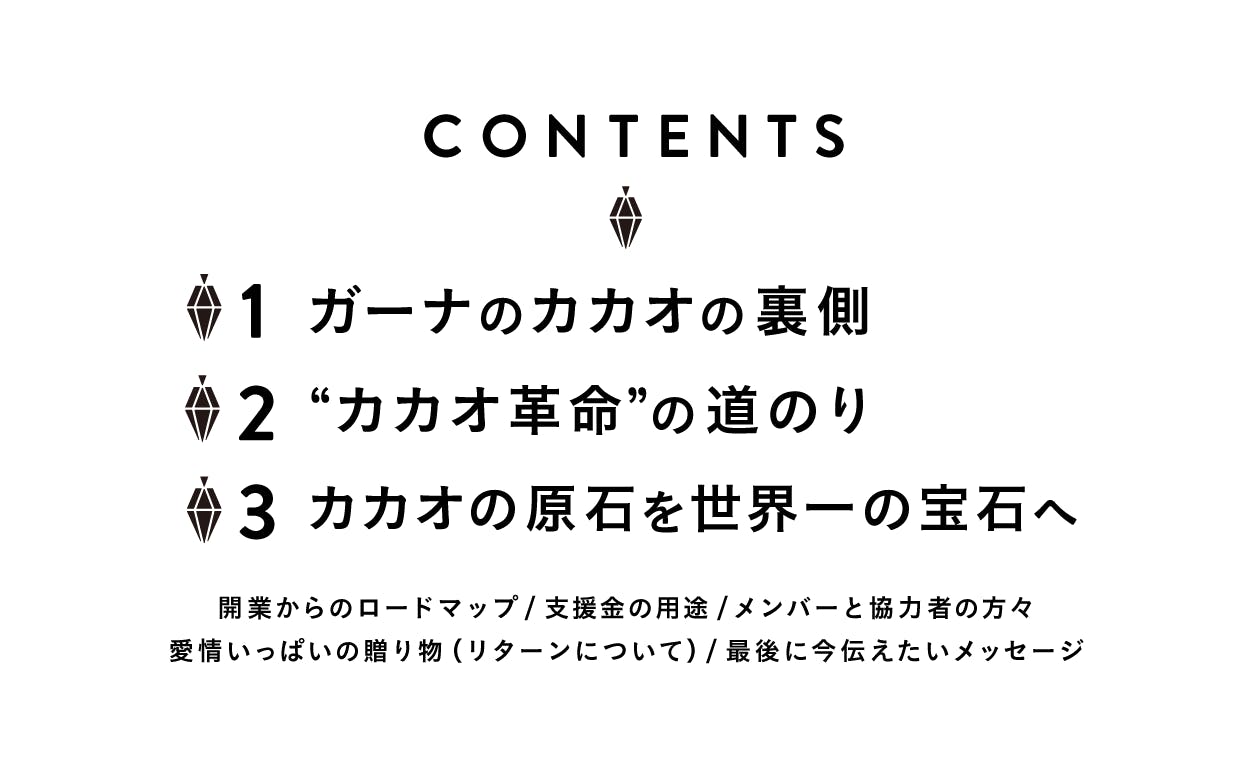 最後まで一人でも多くの方に、私たちとガーナの人々が想いを込めて作ったチョコレートを届けるため、新しいリターンを用意させていただきました!カカオの魅力が詰まった贈り物をぜひお楽しみください。