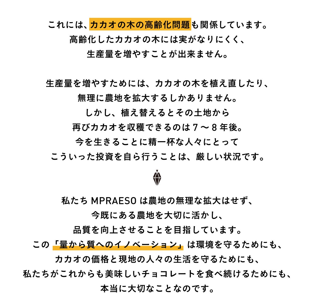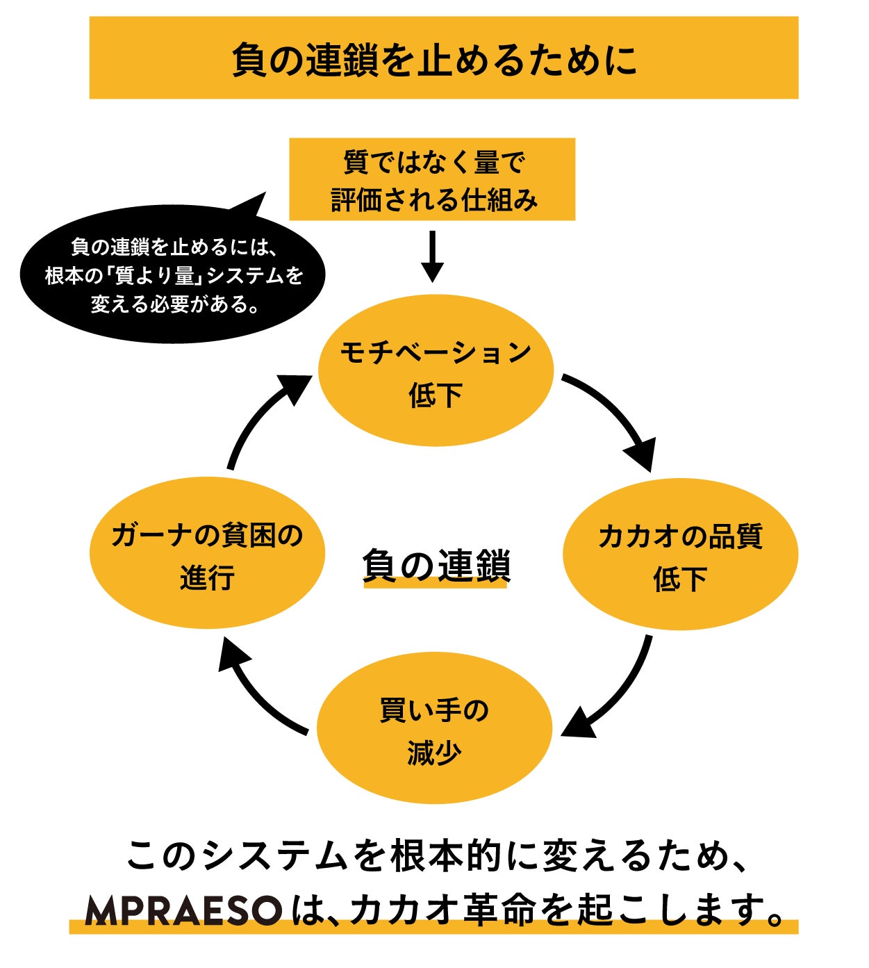 MPRAESOが起こす、一番大きな変革は還元の仕組みにあります。ガーナの人々はいつも明るくて幸せそうです。しかし一緒に暮らしていると、彼らの他の面も見えてきました。夢があるのに学校に通うことを諦めなくてはいけない人、数百円の薬を買えずに大切な人を失くしてしまった人...幼い頃からチョコレートが大好きだった私は、この現実を直接目にした時本当にショックでした。