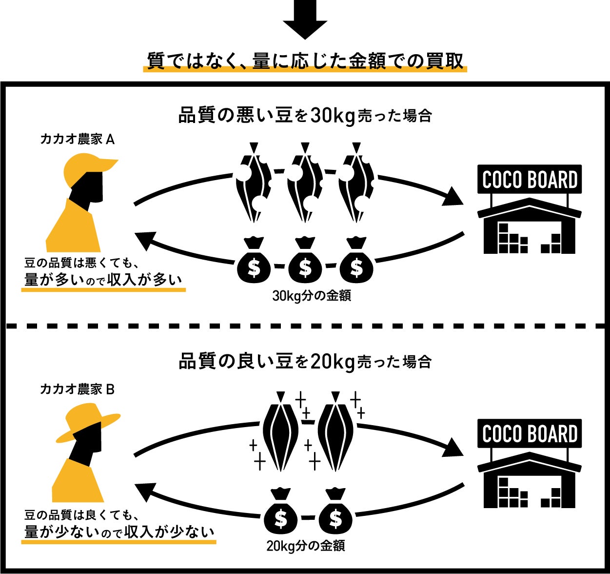 政府がまとめて買取るこの仕組みは、カカオ農家さんにとって、どんなに貧しくてもカカオさえ育てばいつでも売れる場所があるという安心に繋がっていました。しかしこのシステムによる弊害が近年深刻化しています。