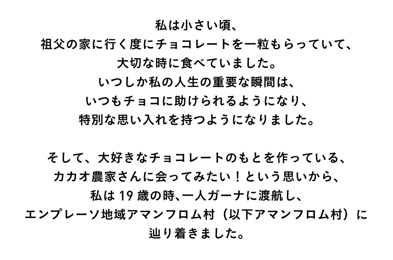 私たちの身近に存在するチョコレート。しかしその原料であるカカオとそれに命を懸けている農家さんのことを考えたことがある人はどのぐらいいるでしょうか? 児童労働やフェアトレードといった言葉が浮かんでくるかもしれません。もちろんガーナは貧困から色んな課題を抱えています。しかし私は、悲しい現実だけを抽出して伝えるのではなく、美しく力強く生きる現地の人々を心の底から尊敬し愛しているからこそ、その彼らの誇りもたくさん伝えたいと思っているのです。