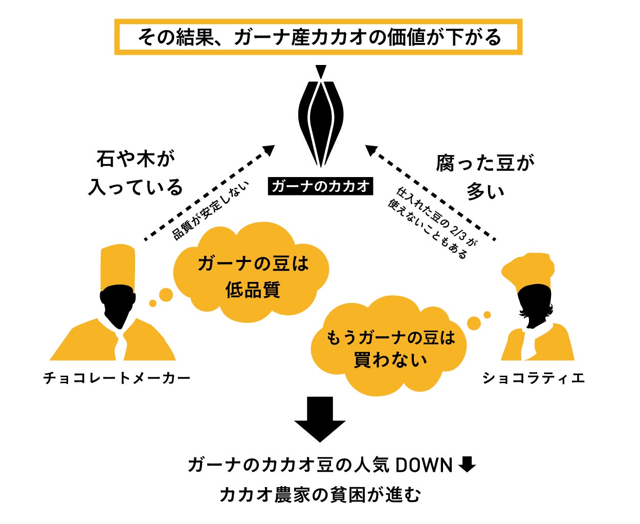 現在ガーナから輸出されているカカオは、低品質で異物が混ざっていることも多いです。日本のショコラティエさんは使えない部分を捨てているのですが、悪い時は3分の1も使えなくて困っているとの声もありました。