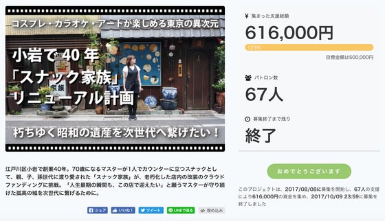 当初の予定より1ヶ月も遅れてしまったリニューアルオープン。ついに本日、なんとかプレオープンを迎える事ができました。 「スナック家族」改め「Galleria Snack KAZOKU」です!新しいサイトアドレスはこちらhttps://koiwakazoku.wixsite.com/kazoku 店内の画像はおとといのものです。ここから飾り付けやセッティングをしてお客様をお迎えできる状態になんとかもっていきます。壁にはピクチャーレールを取り付け、小規模ながら個展などもおこなえるスナックとなっております。 ※プレオープンとは?お店の中の動きを確認しながら行うお試し営業みたいな感じなので、サービスや接客がパーフェクトではありません。ご了承の上でご来店くださいませ。(現在ご予約満席ですが、お時間帯によって入れる場合があるのでお問い合わせください→03-3658-2497(18時以降にならないと繋がりません)クラウドファンディングだけじゃなく、本当にいろんな方の「実働部隊」的なお手伝いご協力のおかげでここまでたどり着く事ができました。本来の予算内ではとても収まりきれない規模の「改修工事」となり、リフォームのレベルじゃなかったですね・・・(床下を開けたら全部腐って崩れ落ちそうだったり、基礎からやり直してめちゃくちゃ大変でした)今日までにやらなければならなかった事が未達成の状態ですが、年内には整う予定で進めています。 ここではご報告しておりませんでしたが、実は今年の6月に妊娠が判明し、現在8ヶ月になります。出産は2月を予定しております。判明した際はすでにクラウドファンディングの計画が動き始めていましたし、家族が増えるのであれば、両親にはより頑張って頂かないとならないのでリニューアルをストップさせるわけにもいかず、自分の勤め先の社長や会社の方々のご理解もあり、やや不自由な体でなんとかここまでやってきました。本来なら編み物でもしながら出産準備をしたかったんですけどね。編み棒の代わりにカンナや電動ノコギリを握る日々でした(笑) 昼間の勤め先は1月半ば過ぎくらいまで頑張りますし、「Galleria Snack KAZOKU」にはできうる限りいる予定なので是非会いに来てくださいませ。 ◆まだこれからおこなうこと・リターンの日本酒・ワインの発送(酒造屋さんの関係で遅れております)・WiFiの設置(設置工事の順番待ちです)・お通しのおでんの準備(通常オープンに間に合わせるぞ)・三芳菊の導入(2018年からになります)・新しいホームページの開設(新しい店内写真の準備出来次第・年内) またこちらでご報告させて頂きます。日々の進捗情報は「Galleria Snack KAZOKU」のTwitterが最新となりますので是非閲覧してくださいね。https://twitter.com/koiwakazoku