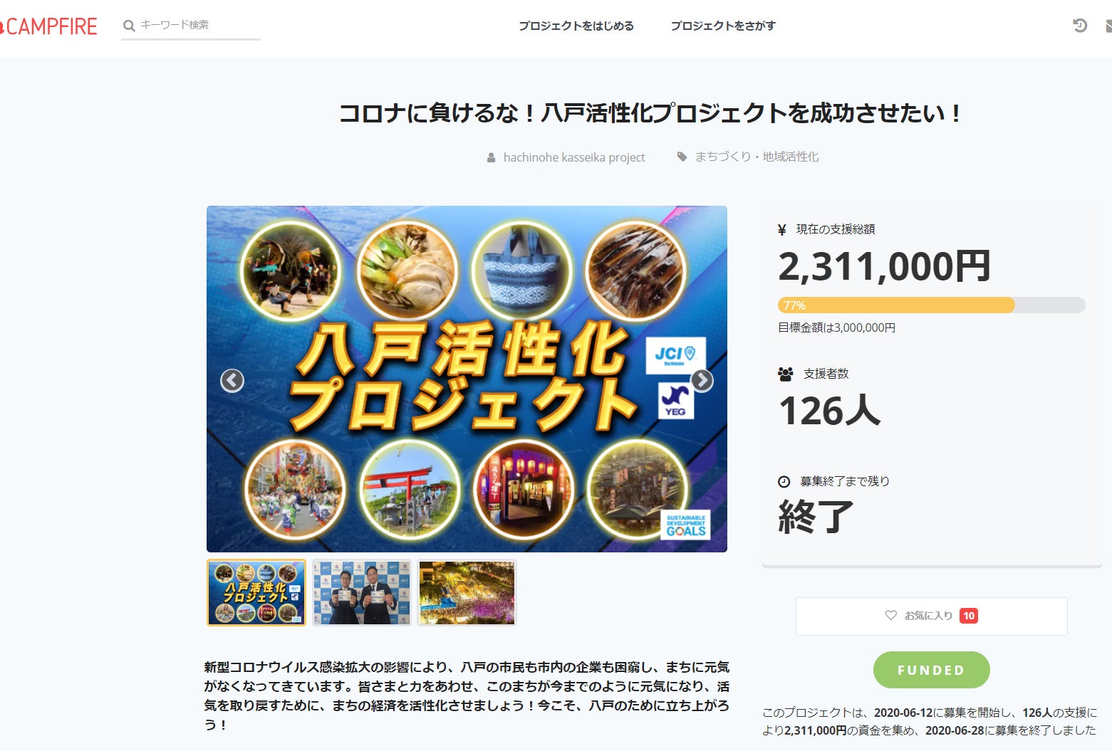 6月14日よりスタートしました「八戸活性化プロジェクト」は6月28日(日)23時59分59秒を持って支援募集を無事終了いたしました。短い期間中でしたが、皆様からの多くのご支援と心温かいメッセージをいただきました、心より御礼申し上げます。 皆様からの温かいご支援によって、支援者数126名の方から支援総額2,311,000円のご支援を頂くことができました。こちらの支援金は各事業所様へお届けするべく、手続きを進めて参ります。 今回のプロジェクトは多くのメディアにも取り上げていただき、情報拡散のご協力をいただきました。そこから皆様の八戸のまちを思う大切な気持ちが連鎖して、多くの方に知っていただけたのだと感じます。また、期間中はSNS等の投稿やシェアにも多くの皆様のご協力をいただきまして本当にありがとうございます。 返礼品の八戸活性化チケットにつきましては7月上旬より準備ができ次第、ご支援していただいた皆様へ順次発送させていただきます。返礼品のお届けまで楽しみにお待ちいただけたら幸いでございます。 この度の温かいご支援・ご協力いただけましたこと、八戸活性化プロジェクト実行事務局一同、心より感謝申し上げます。誠にありがとうございました。