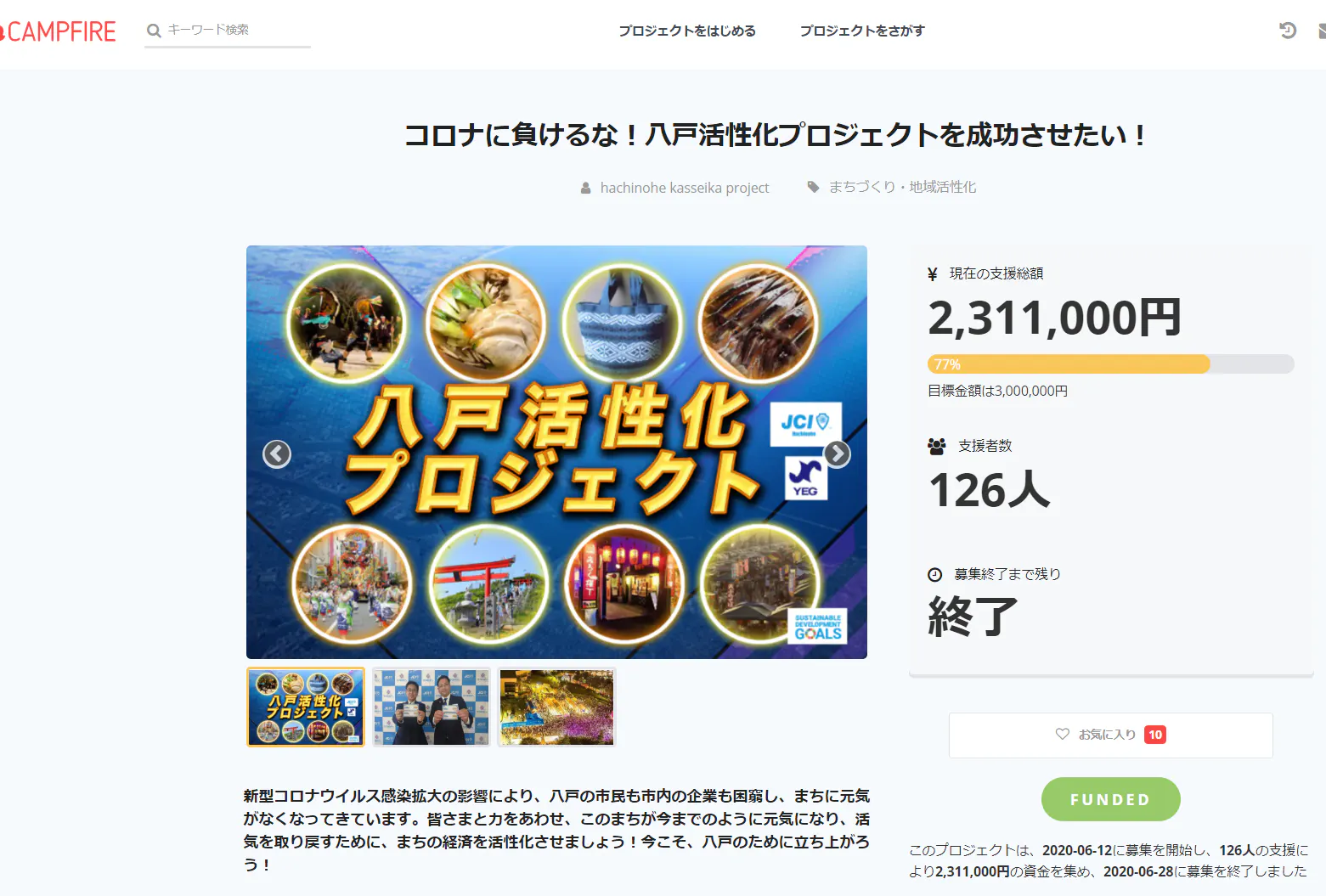 6月14日よりスタートしました「八戸活性化プロジェクト」は6月28日(日)23時59分59秒を持って支援募集を無事終了いたしました。短い期間中でしたが、皆様からの多くのご支援と心温かいメッセージをいただきました、心より御礼申し上げます。