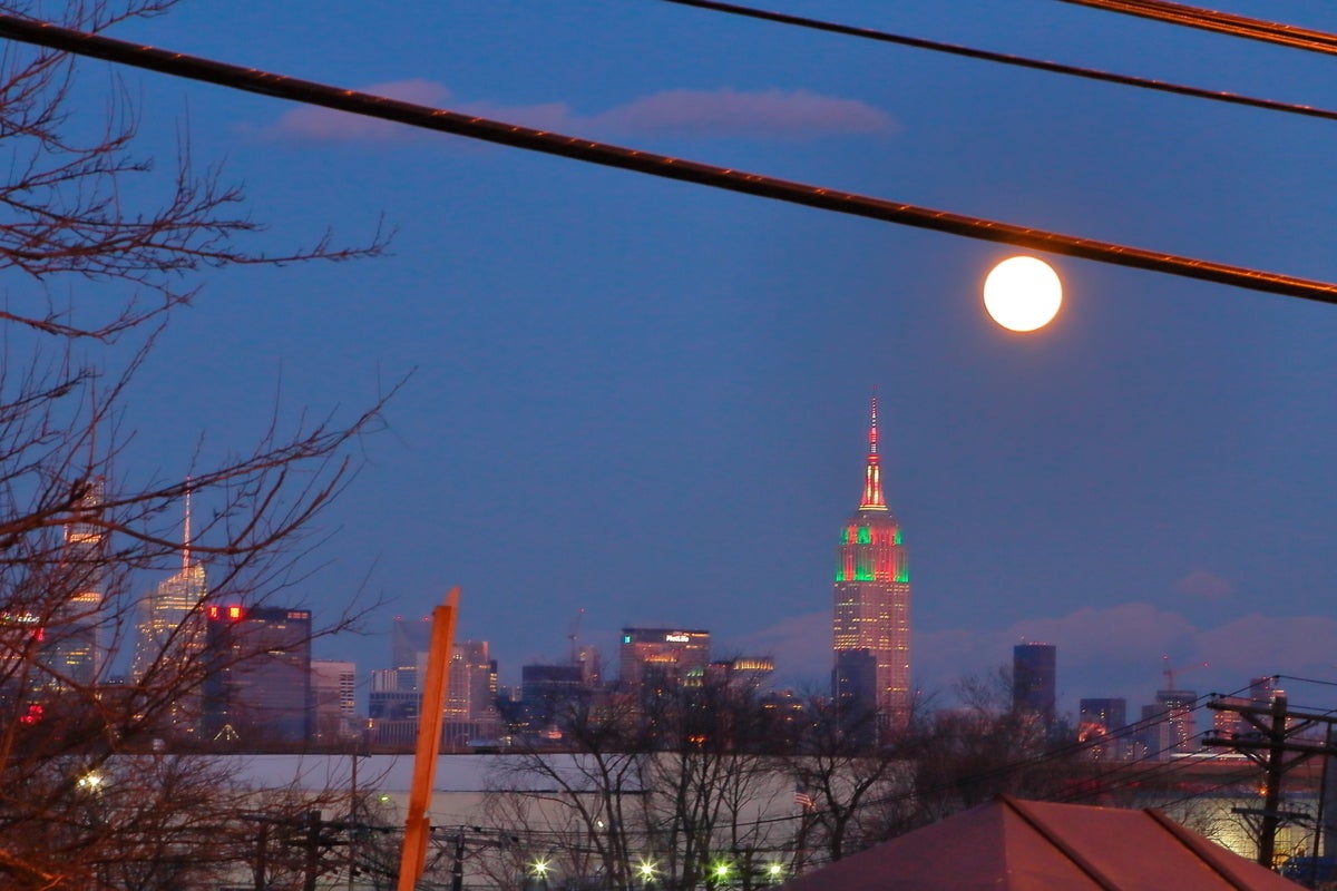 「高台」+「スーパームーンとランドマーク(この日はエンパイアステートビル)がうまく重なる場所」を調べ上げ、下見に行き、当日の撮影現場として使えるか見極めます。この日は以下のロケーションになりました。左上に光る丸がスーパームーンで、丁度エンパイアステートビルと重なっているところです。