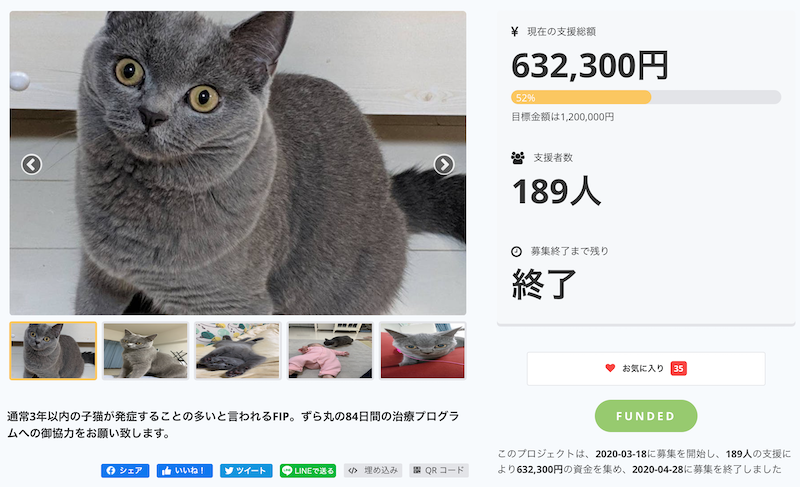 2020/06/27 18:02いつも当プロジェクトを支援して頂きまして、誠にありがとうございます。再挑戦のプロジェクトも昨日0時で終了致しました。最後の日には前回のプロジェクト同様、40人近くの方に支援をいただくことができまして、感謝申し上げます。プロジェクト自体は終了致しましたが、活動報告にてずら丸の寛解まではご報告させていただければと思いますので、引き続き宜しくお願い致します。現時点までの収支状況をご報告させて頂きます。第一回プロジェクト総支援額:632,300円手数料等:118,240円振込金額:514,060円第二回プロジェクト総支援額:341,000円手数料等:63,767円振込金額:277,233円総振込額:791,293円通院費用等(通院費用+交通費)03/11 2,810円03/14 72,509円03/16 296,758+5,230=301,988円04/02 332,420+5,230=337,650円05/09 367,390+5,020=372,410円05/31 32,340+5,020=37,360円費用合計:1,124,627円総振込額ー費用合計=−333,334円上記が収支結果となります。皆様のご協力のおかげで30万円ちょっとの負担額でずら丸の投薬を終了することができました。定期通院はまだ7月頭にも予定しておりますが、血液検査等のみでございますので、そこまで大きな金額はかかることはないかと思います。ずら丸がここまで元気になることができたのも、ご支援をいただいた皆様、応援をしていただいた皆様あってこそです。寛解まではまだ長い道のりではございますが、最後までお見守りいただければ幸いでございます。7月中にリターンの発送はさせて頂ければと思いますので、楽しみにお待ちいただければと思います。今後とも何卒宜しくお願い申し上げます。 もっと見る