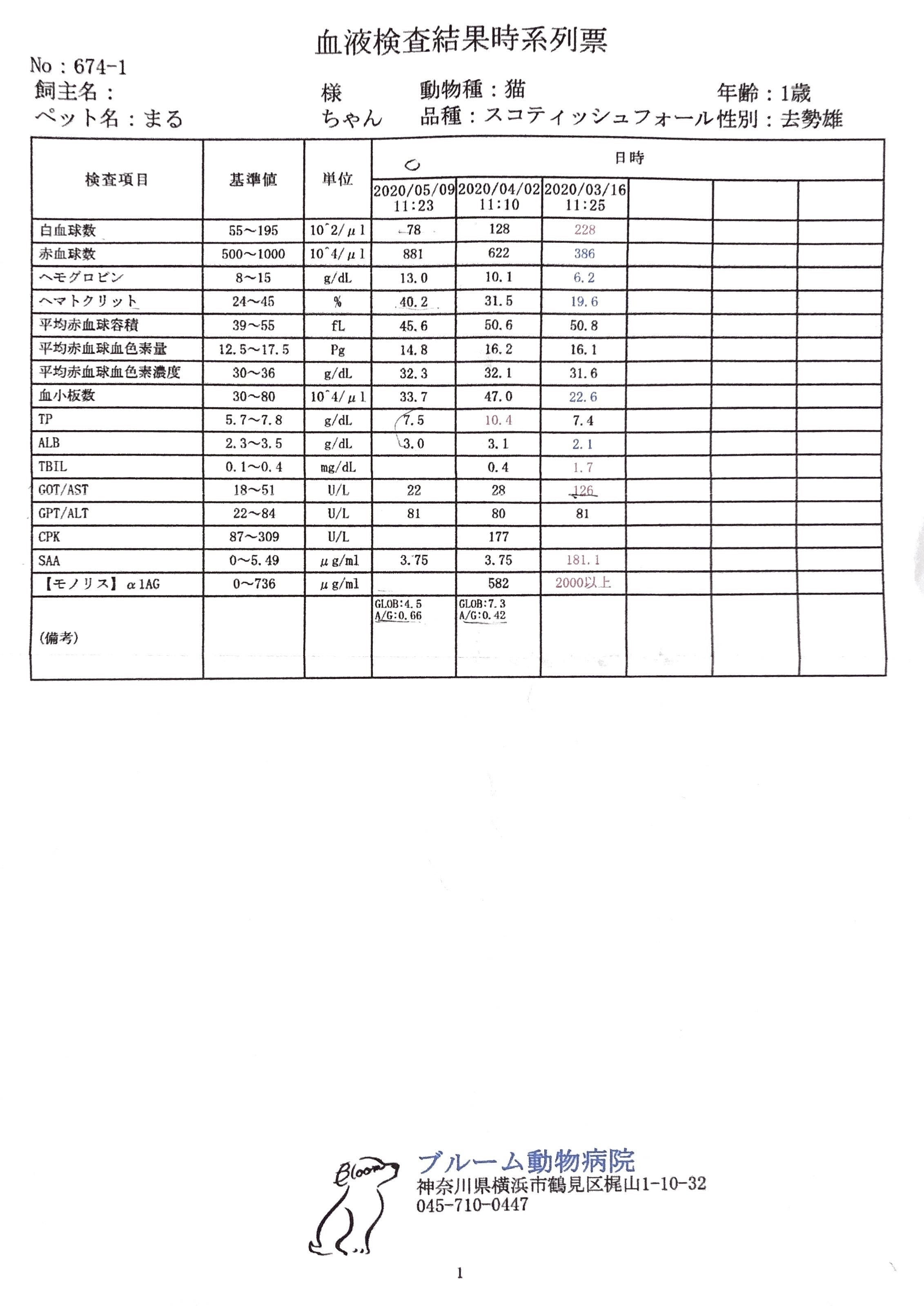 5月9日に横浜の病院まで定期通院に行って参りました。血液検査、腹部エコー検査など精密検査を行なって参りました。結果は下記の通りでございますので、まずご確認頂ければと思います。