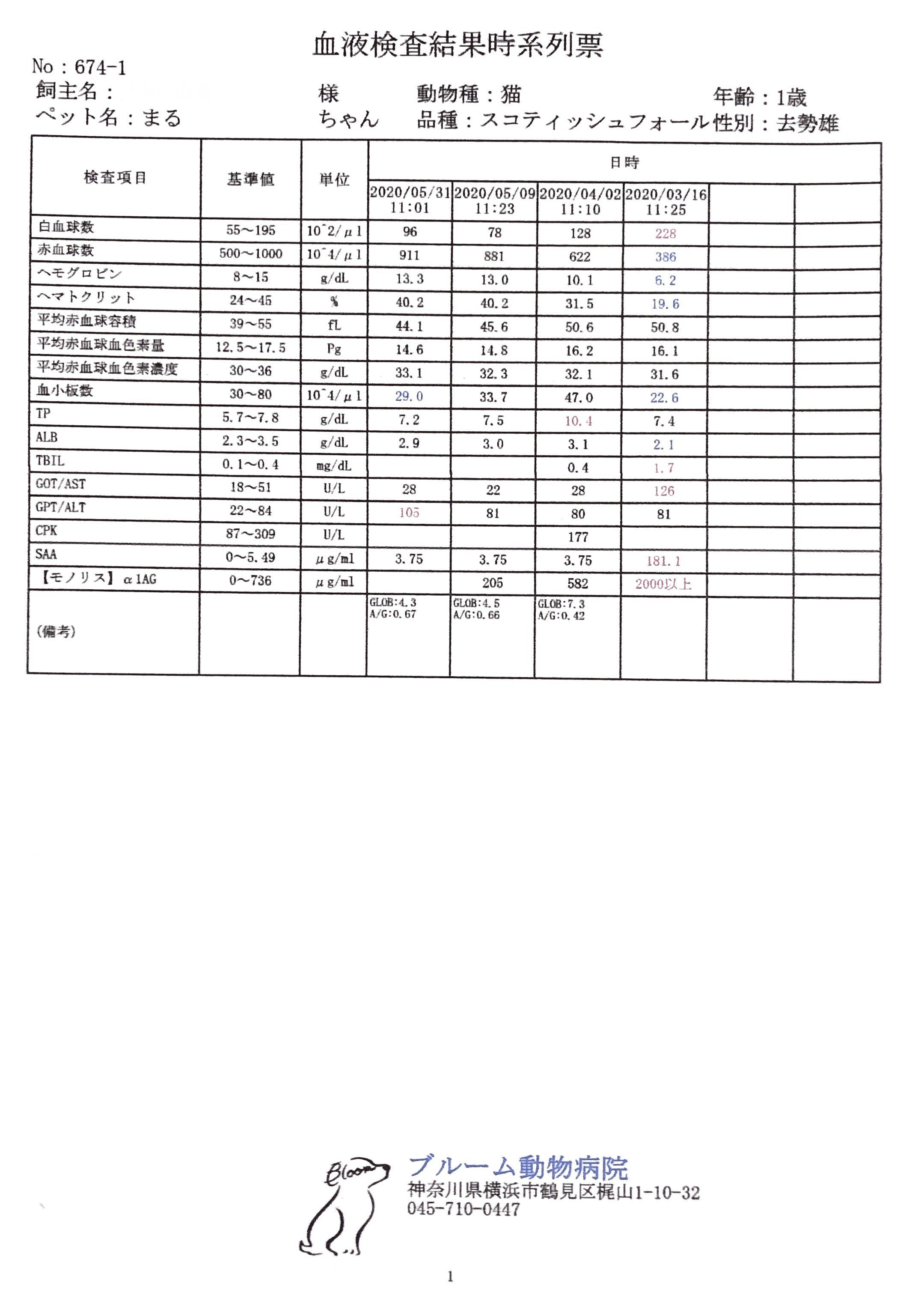 診察としては糞の検査、猫コロナウイルスを保有しているかの検査、血液検査を行ってまいりました。血液検査の結果は下記の通りとなります。