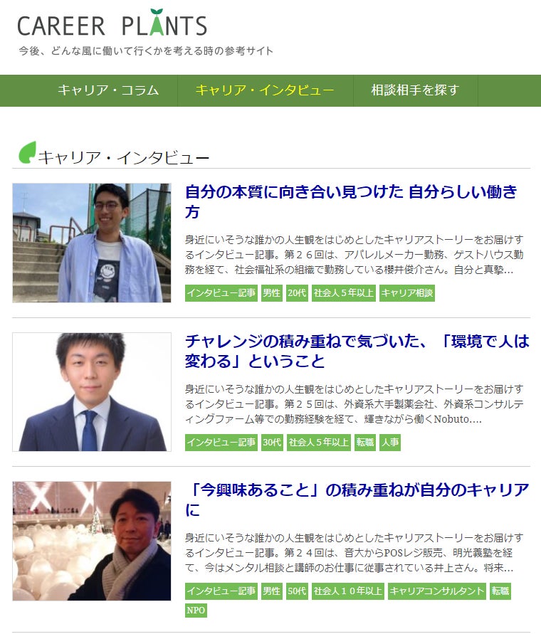 第1弾は、キャリアインタビュー。他のメディアでキャリアに関して紹介してるようなキラキラした起業家などの成功者のキャリア談というよりも、「身近にいそうな誰かの人生観をはじめとしたキャリアストーリー」をお届けすることを大切に月1人以上の方を紹介しています。