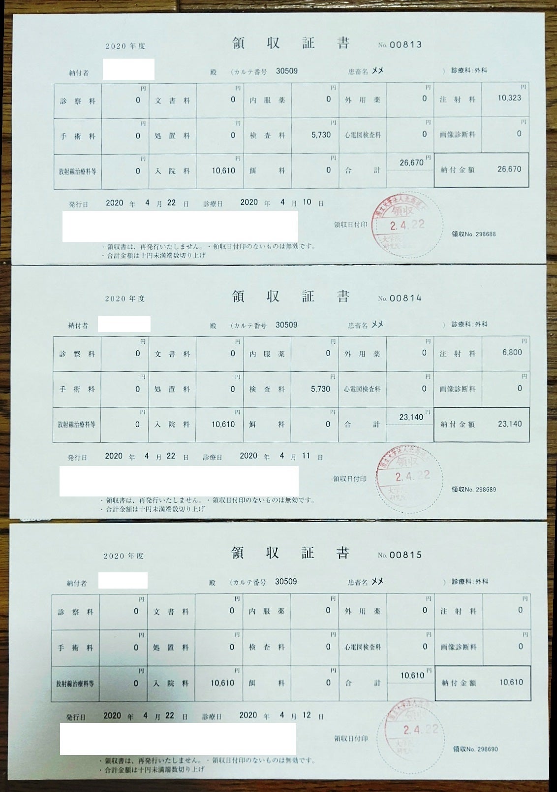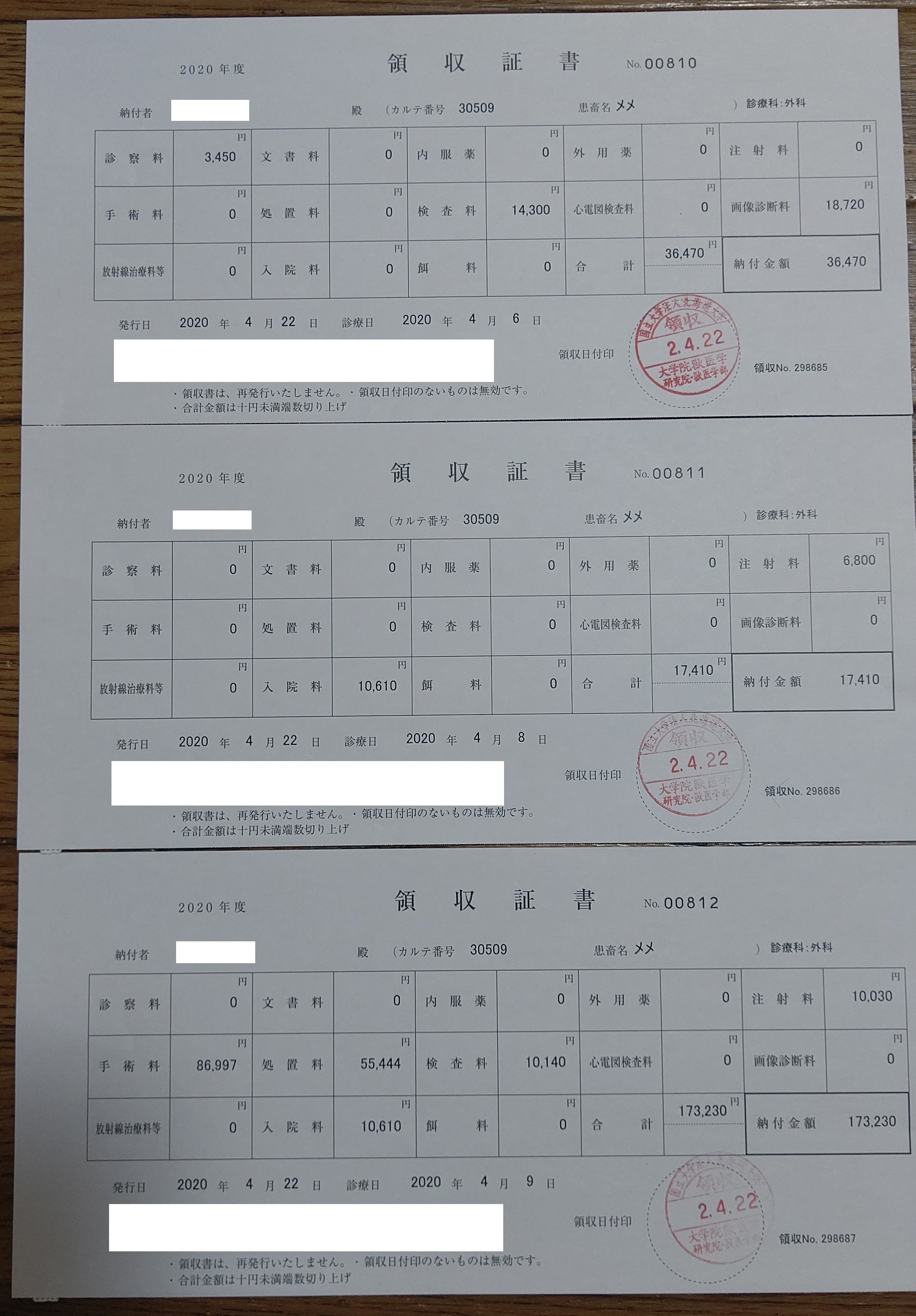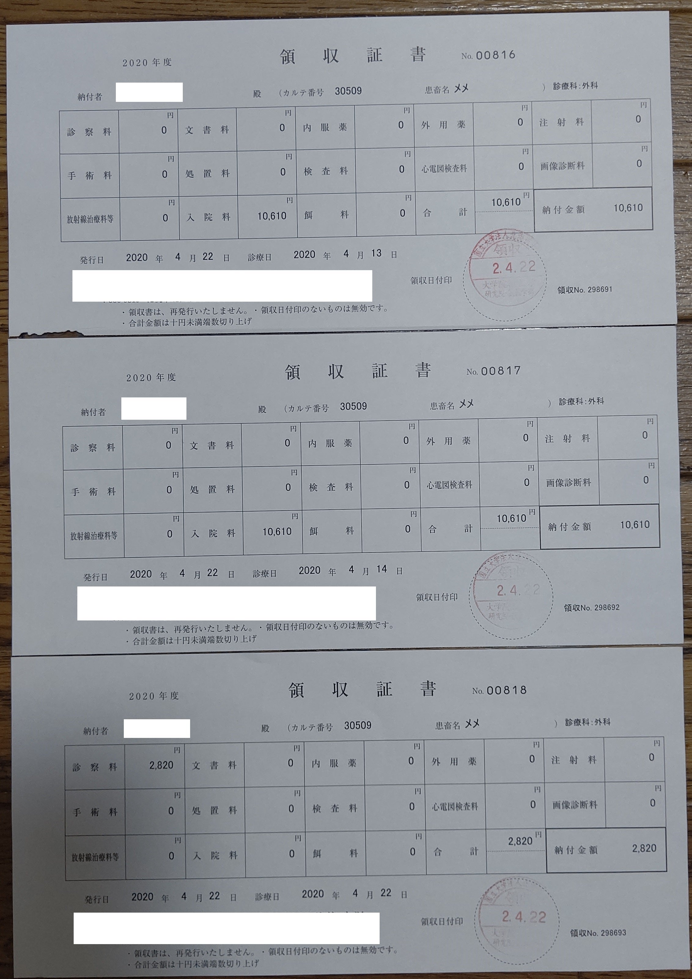 4/9 大学病院 手術 ¥0(支払いは4/22)