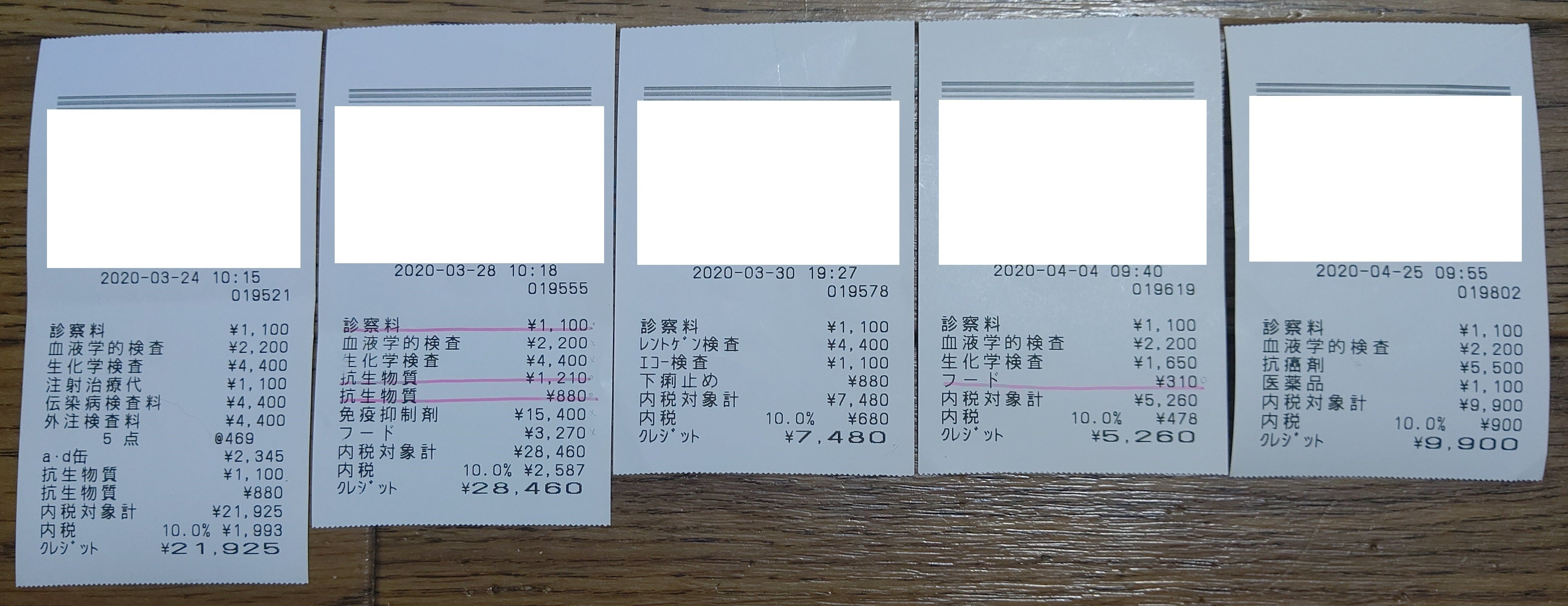 ※3/28、4/4はメメ以外の猫も一緒に病院に連れて行きました。メメの治療費は赤線を引いている分のみです。
