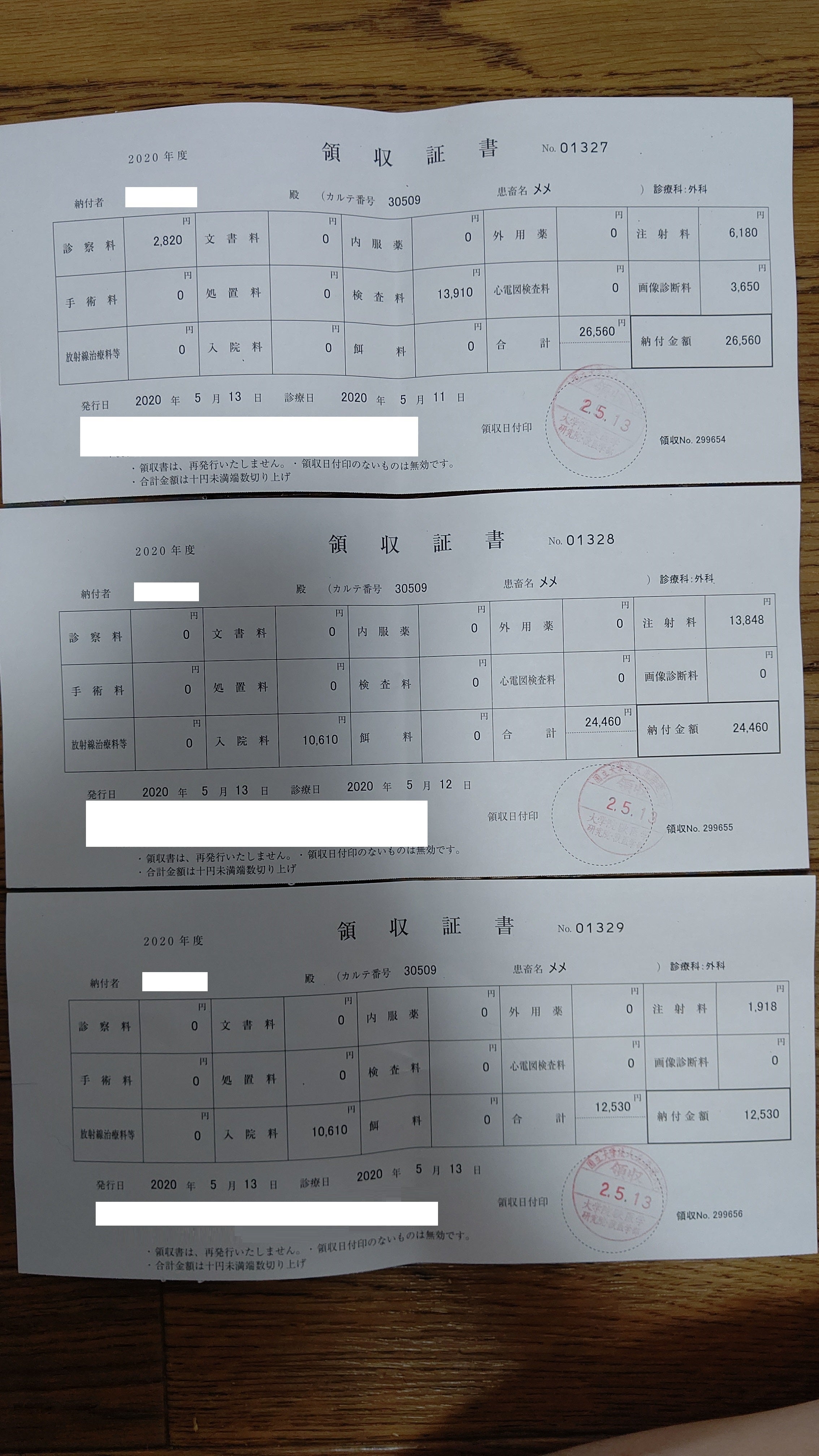 5/11〜5/13入院分を退院時にまとめて支払いしております。3日間で63,550円です。