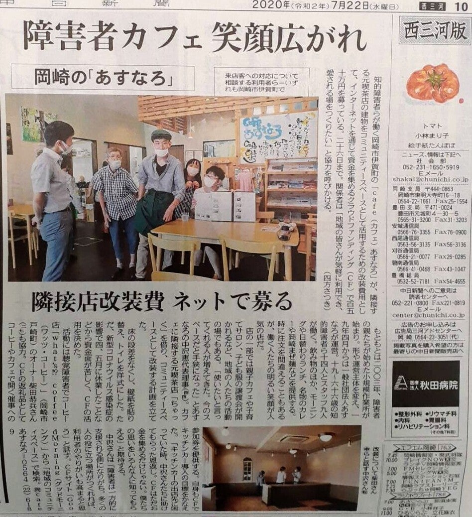 愛知県岡崎市にある「cafeあすなろ」ここでは障がいを持つユニークな店員やスタッフが、美味しいごはんを提供しています。コロナの影響で休業もありましたがそれでも希望は捨てていません。皆様のご支援のもと地域のコミュニティスペースを開き、みんなが繋がって楽しめる場所を作りたい!そんな想いを応援しましょう!