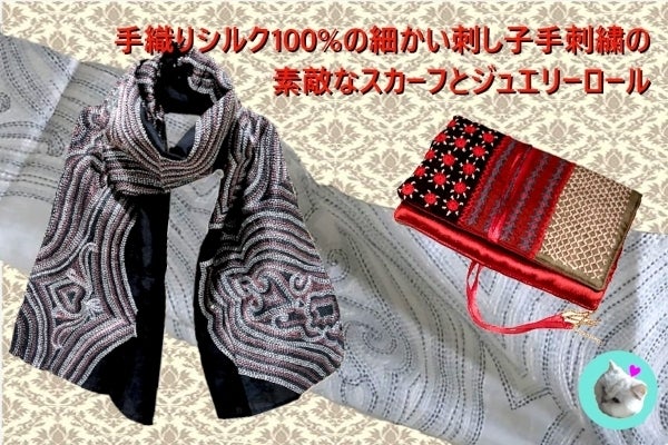 A) 本体も手織りのシルク100%の素材に、とても細かい刺し子の刺繍を施した美しいスカーフです。