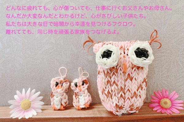私は小学3年生の時にレインボールームという手芸に没頭し、ゴムで様々な作品を作ることが特技となりました。今回のプロジェクトでは、レインボールームで「幸運を運び家族をつなぐフクロウ」を製作し、医療従事者、介護施設職員、ライフラインを支える方々と家族にお贈りすることで、心がほっこりし、離れていても一緒に頑張っているという繋がり感を持っていただけたらと思っています。