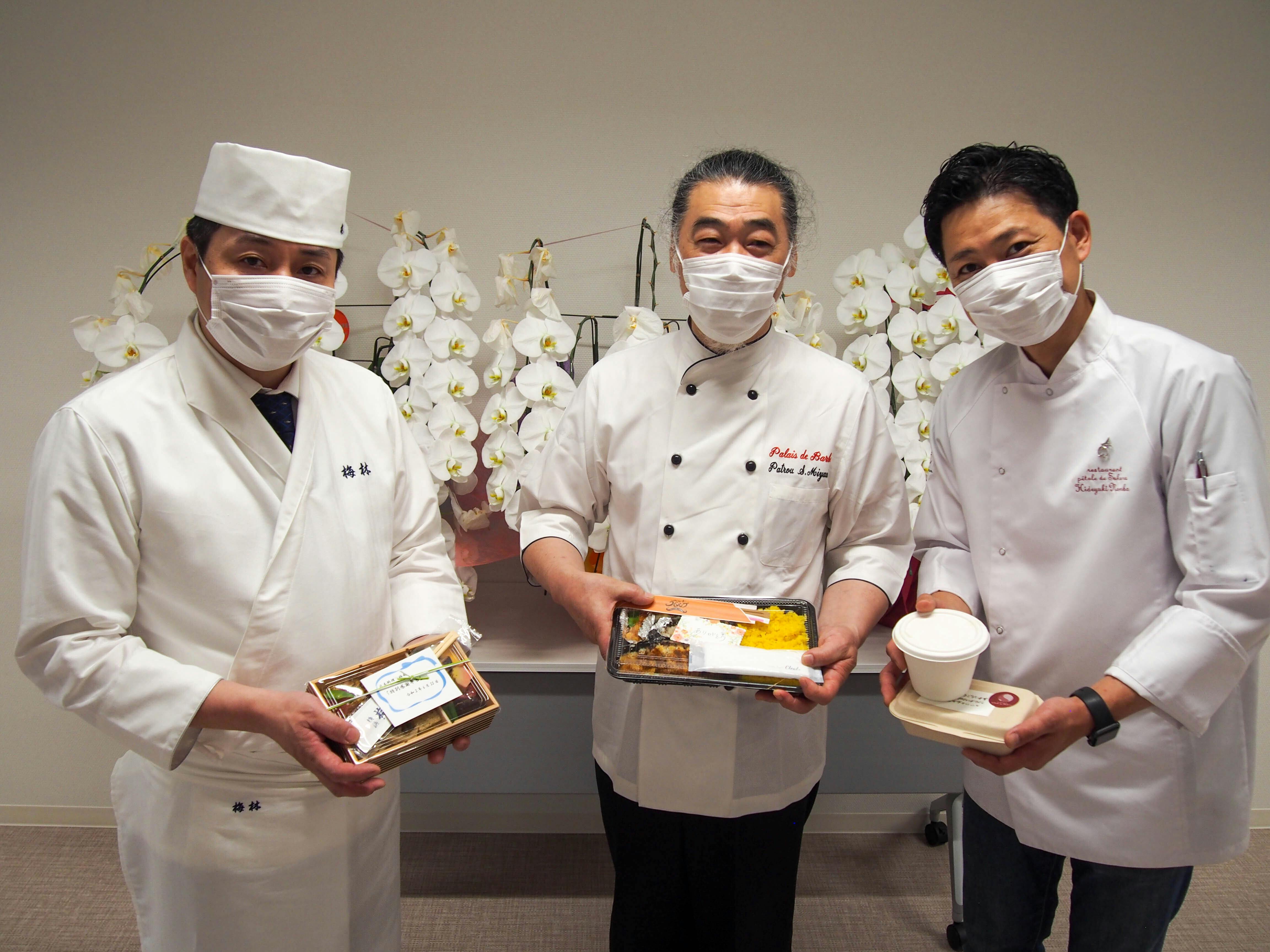 本日22日は、日本料理梅林の山下店主、パレ・ド・バブルの宮内シェフ、ペダル ドゥ サクラの難波シェフの3人が医療従事者の方にお渡ししました。