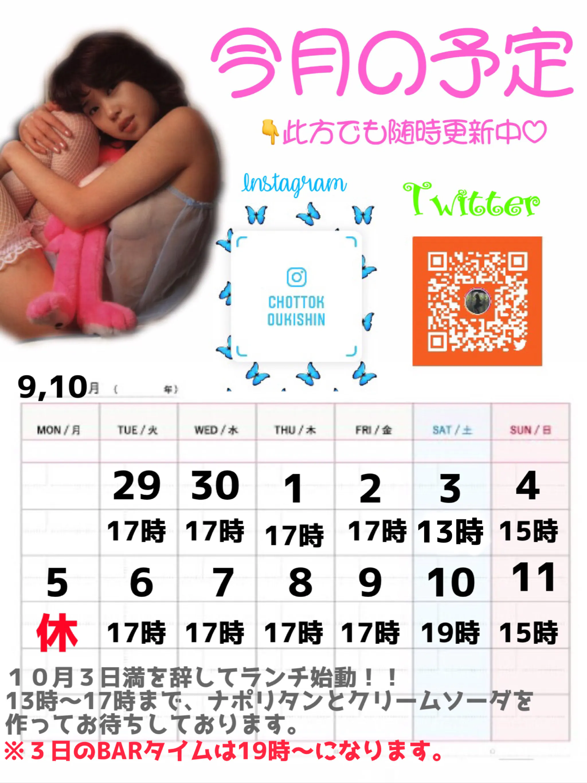 来週は月曜がお休みで29、30は17時にオープン致します。