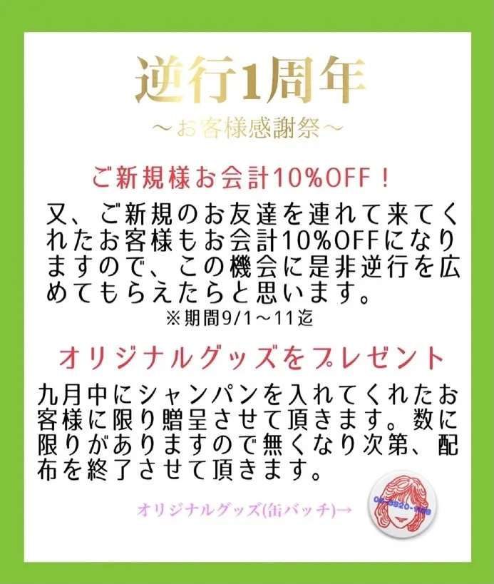 是非恩返しをさせて頂きたいので、9/1〜11までの期間は新規のお客様及び、新規のお客様をお連れのお客様はお会計から10%OFFさせて頂きます!