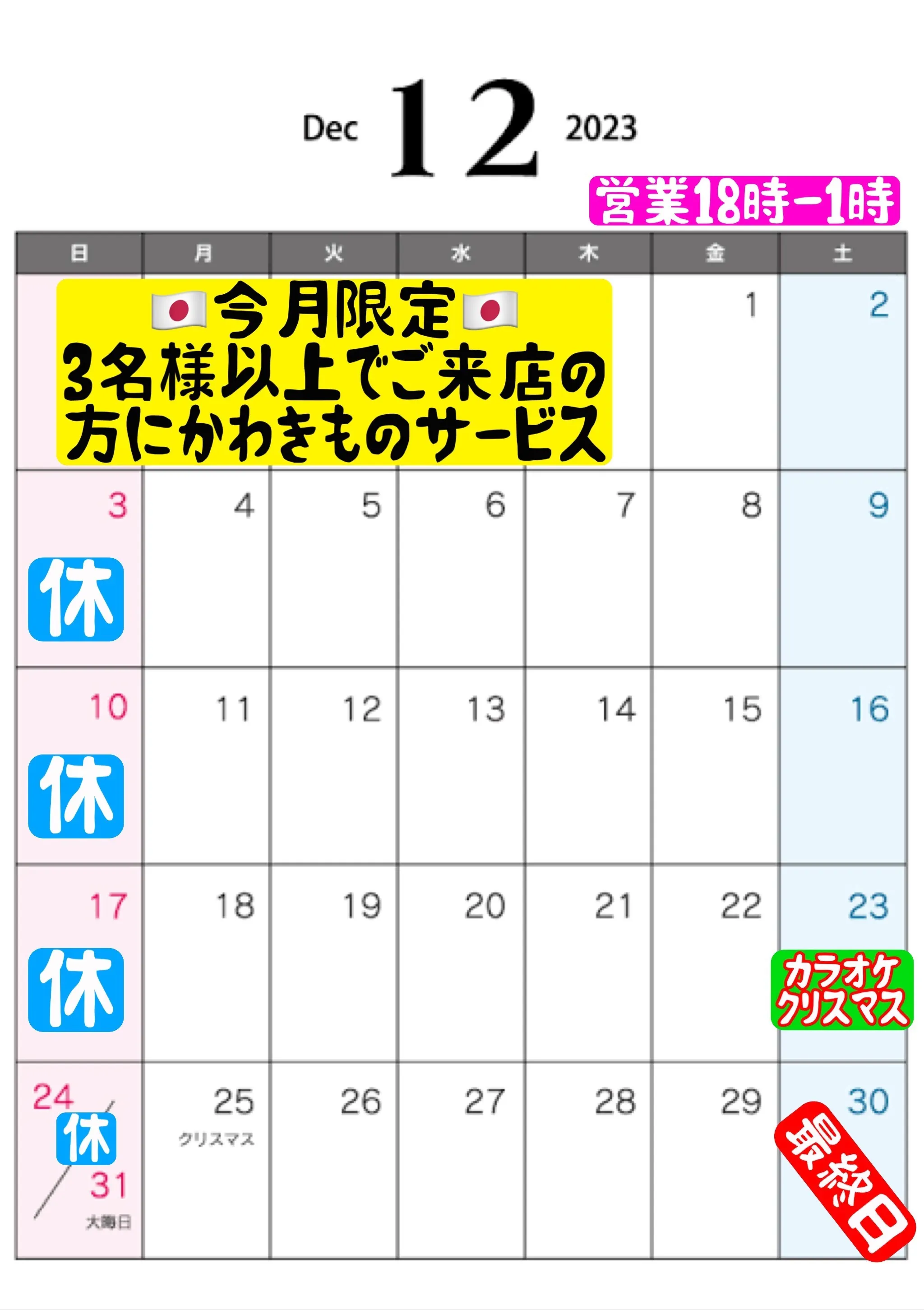 12月は30日(土)まで営業いたしますので、何卒よろしくお願い致します。