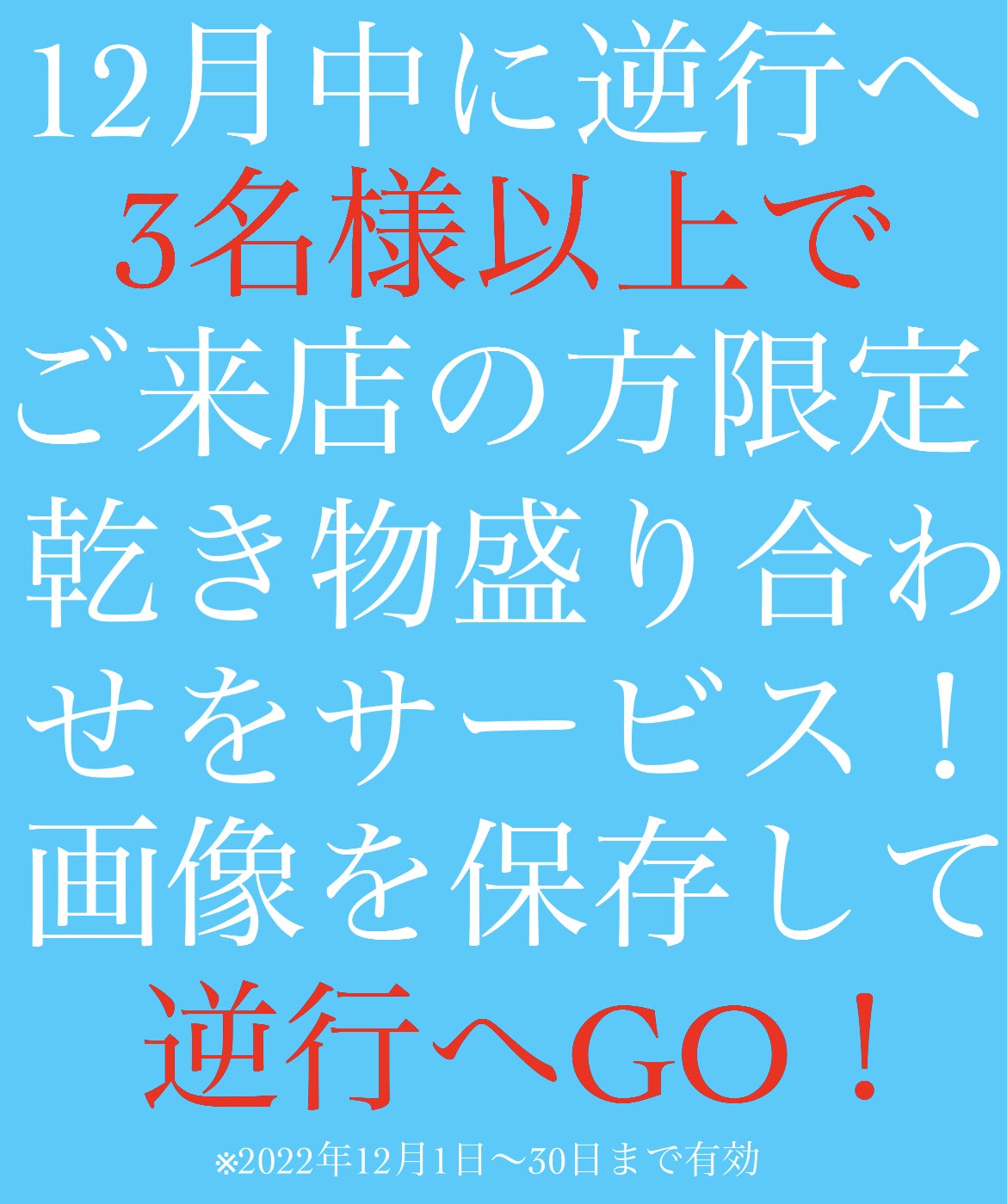 早いもので、12月となりました。今年最後の思い出を作るお手伝いを是非させてください(*'▽'*)12月中に3名様以上でご来店の方は乾き物盛り合わせをサービスさせて頂きます♪期間中何度でも使えますので、是非忘年会などでご活用ください。使う際は上の画像をスタッフまでご提示くださいねー!!2022年ラストは30日まで全力で駆け抜けますので、今月も宜しくお願い致します╰(*´︶`*)╯♡