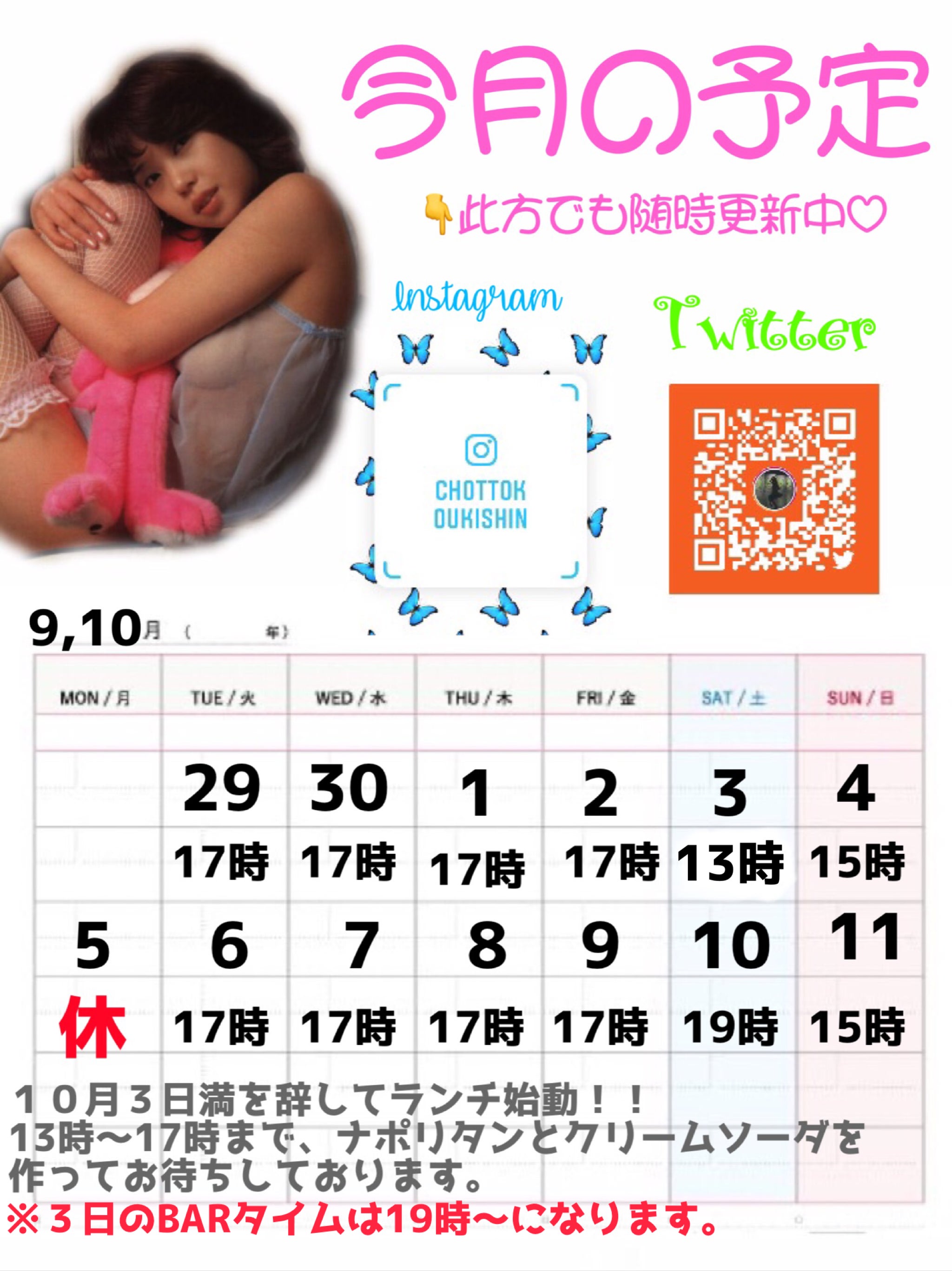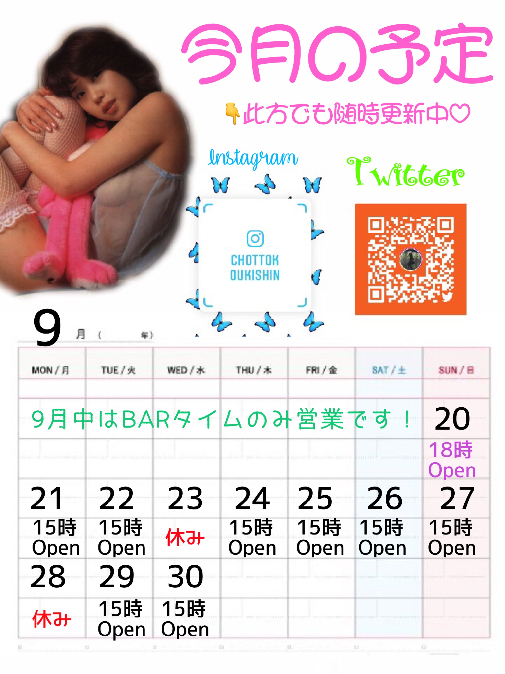 お世話になっております。おもいで処逆行、スタッフあさのです。営業時間の変更と、今まで不定休だったお休みのお知らせです。新たに告知などが無い限り平日18時土曜19時日曜休み祝日18時祝日の翌週に振替休日を設けます。に変更致します。お時間合う時にぜひ遊びにいらっしゃって下さい。また、ご協力頂きましたクラウドファンディングのリターン「貸切券」をお持ちのお客様へ。ご相談は、直接店舗にお越し頂くか、お電話、各種SNSへDMにてお問い合わせ宜しくお願い致します。まだオープンして1ヶ月と経たない店舗ですので、どこよりもキレイでどこよりも感染リスクの少ない店なのでは!?と思っております。店内、常に換気&消毒して営業中なので、安心してご来店下さい。皆さまにまた逢える日を楽しみにしております。