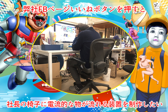 ということで、Facebookページにいいねボタンを一回押すごとに、社長の椅子に電流的なものが流れる装置を制作したいと思います。