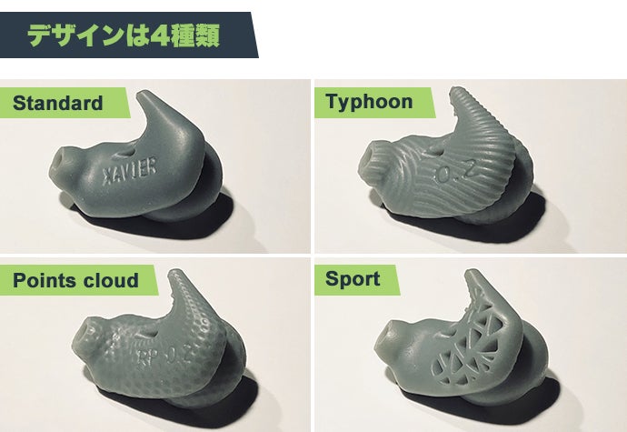 イヤーチップのデザインはStandard,Typhoon,Points cloud,Sport typeの4種類でカラーはグレーです。