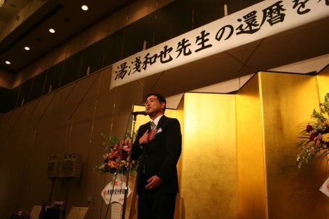 今年2月に行われた還暦を祝う会より。このスピーチでも語ったのは「謙虚」と「感謝」でした。