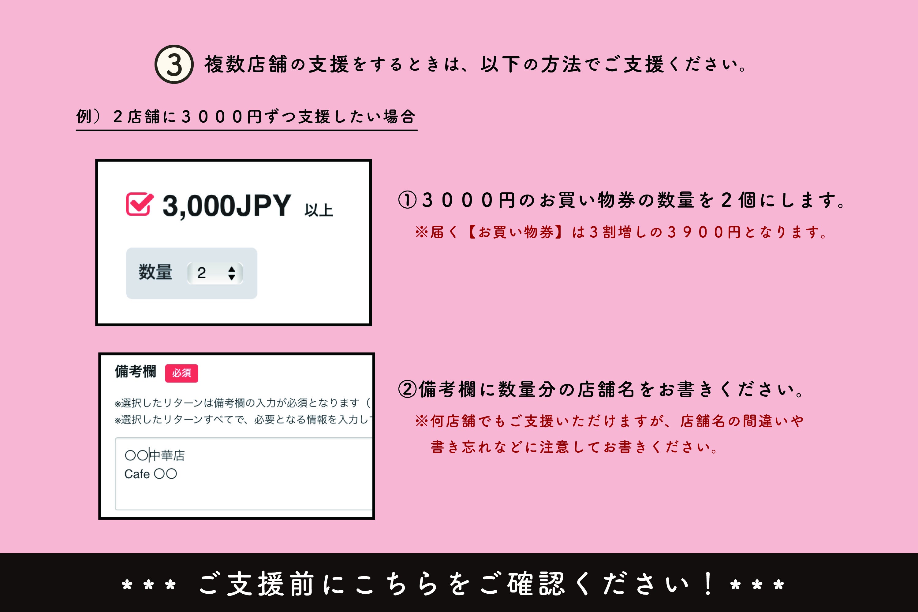 *1回の決済に220円の手数料がかかりますので、同時に複数の店舗を支援したい場合は、まとめて支援がお得です。この場合は、①支援したい店舗数分の個数を指定して、②備考欄に個数分の店舗名をご記入ください。(注:数量と店舗数が異なる場合は、お買い物券が発送できませんのでご注意ください。この場合、支援金は備考欄に記入いただいた店舗に均等に分配させていただきます。ただし、1,000円未満の端数が生じた場合は「全体支援型」として取り扱わせていただきます。)