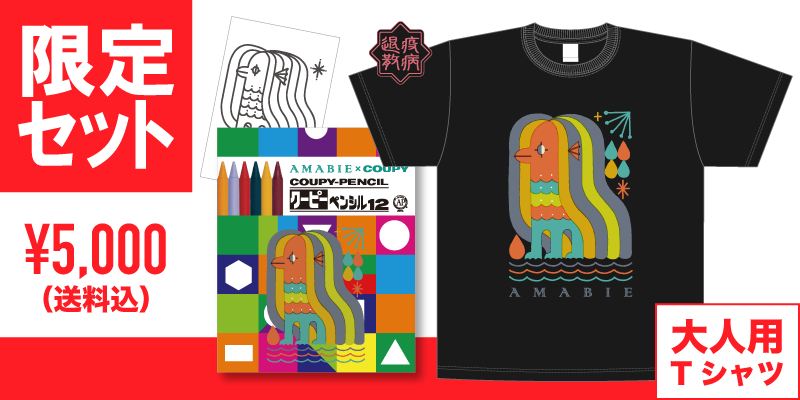 〈リターン〉先行販売のアマビエクーピー、ぬり絵ポストカード、大人用Tシャツ(限定カラー:ブラック・サイズ:S/M/L/XL)