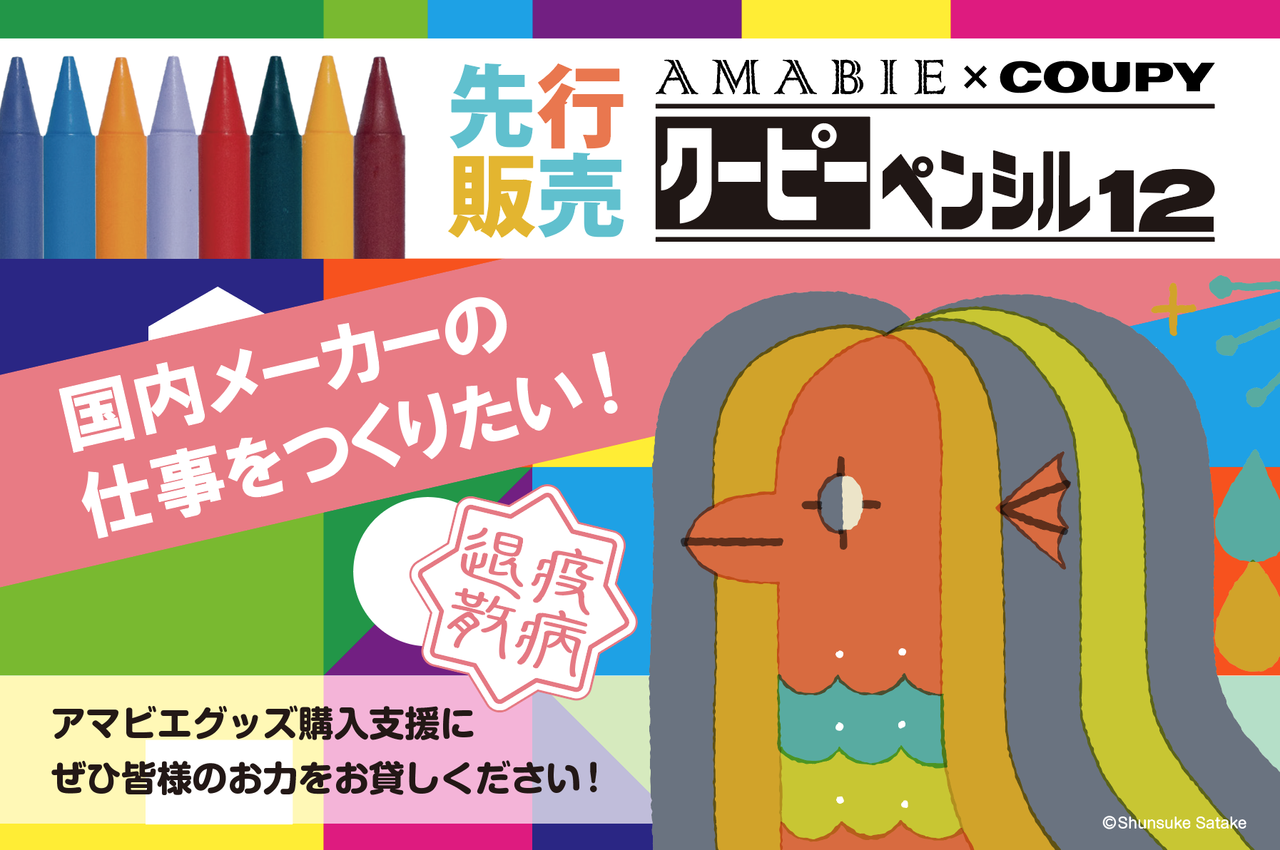 過去にはグッドデザイン賞も受賞されているイラストレーター・サタケシュンスケさん全面協力のもと、アマビエ疫病退散プロジェクトがスタートしました。
