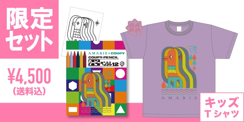 〈リターン〉先行販売のアマビエクーピー、ぬり絵ポストカード、キッズTシャツ(限定カラー:ライトパープル・サイズ:100/110/120/130)