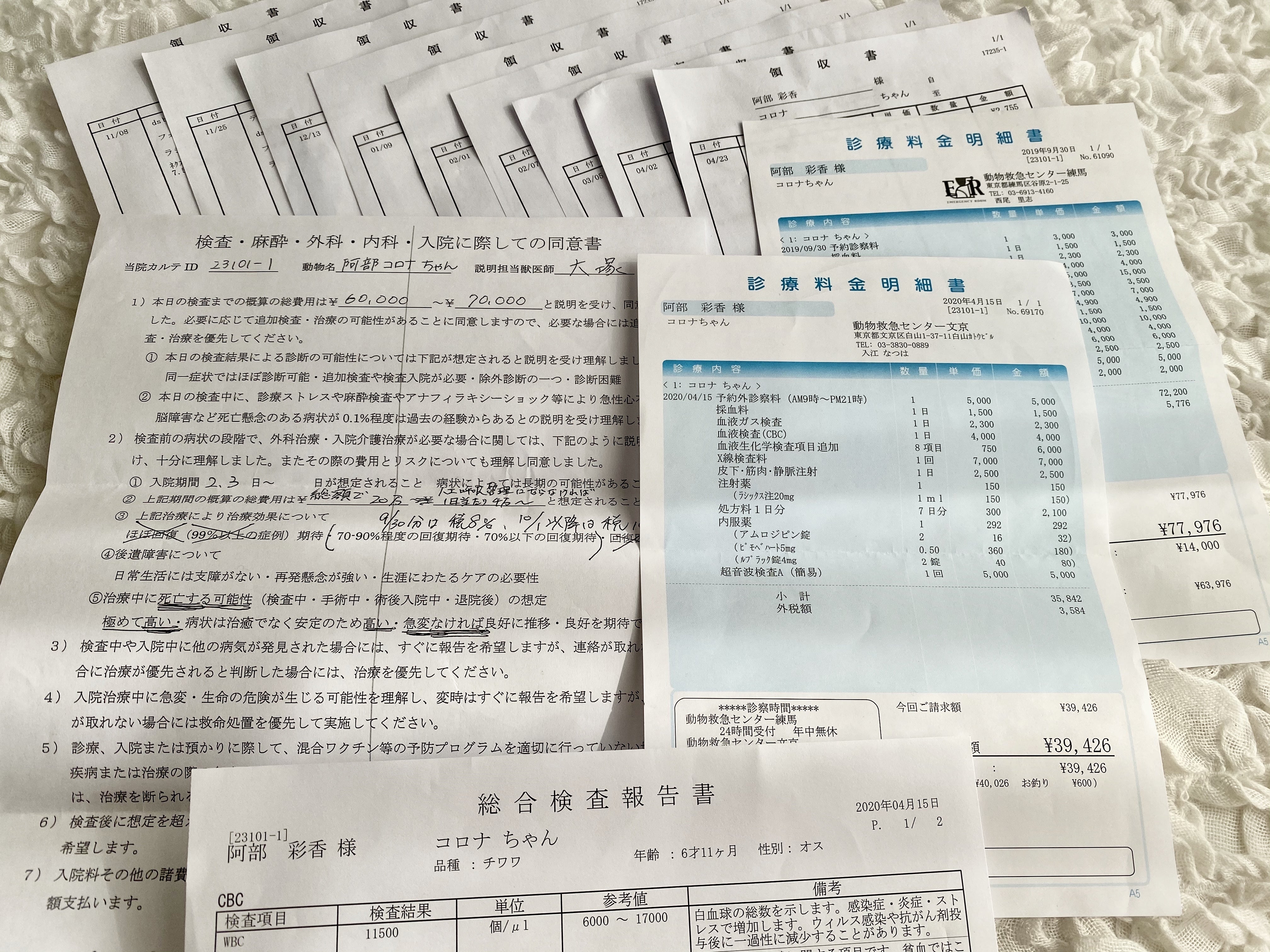 2020/07/19 08:536月28日を以て終了した本プロジェクトにご支援、応援くださった全ての方々、本当にありがとうございました!ご報告が遅くなり大変申し訳ありませんでした。月末から仕事もより一層忙しくなり、休みを作っていなかった為なかなかまとまった時間が取れずこちらでのご報告が遅れてしまいました。このプロジェクトは332名1,560,000円もの金額を集めることができ、募集終了しました!(残念なことに終了時335名1,563,000円でしたが、カードの不正利用の報告が来るというハプニングもありました…泣)たくさんの方々にご支援頂き、目標達成とはなりませんでしたがこれほどの資金を募ることができました。心より感謝申し上げます。正直、ここまで集まるとも思っていませんでしたし、周りからも心配されましたが本当にたくさんの方々がご協力をして下さったお陰です。ありがとうございました!!この集まった資金は全て、こっさんの手術費に充てさせていただきます。クラウドファンディングに踏み切るまで悩みに悩み、やるべきかどうかや周りの目なども気にして、期間中もこの選択は正しかったのか…などと悲観的に考えることも度々ありました。私にはかなり勇気のいる選択でした。批判やお叱りを受ける覚悟で始めたクラウドファンディングでしたが、終了に至るまで有難いことにむしろ応援して下さる方々ばかりで、InstagramやTwitter、Facebookでは数多くの拡散のご協力を頂き、たくさん支えていただき無事終了を迎えることができました。感謝してもしきれないほど、身に余る思いです。みなさんの応援もあってか、こっさんも元気にがんばって生き延びてくれています。たくさん悩んだ末に、不安ながらも始めたクラウドファンディングでしたが、終わってみて本当にやって良かったと思いました。終了後も、間に合わなかったからとお声を掛けていただき、直接ご支援頂いた方も居ました。この他に期間中も直接ご支援頂いた方々も居ます。更に先日、近所を散歩していてたまたまご挨拶をした15歳のご長寿犬2頭を連れていたママさんとお話した際には「これも何かの縁だし、うちの子はもう手術もしてあげれないから…その分がんばって生きて欲しい!」と見ず知らずの私達にご支援頂きました。そしてそこで一緒に話していた美容室のおば様からもご支援を頂いたのです。(こんなことって本当にあるんですね…感激)まさか道端でたまたまわんちゃん同士ご挨拶しただけだったのに、ご支援頂くなんて考えてもいなかったので泣いてしまうほど嬉しかったです。またこっさんが元気になったらご挨拶に伺おうと思っています。ありがたいな、まだまだがんばらねばな、と改めて思いました。色んな方の応援を胸に、手術を乗り越えようと思います!⋱⋰ ⋱⋰ ⋱⋰ ⋱⋰ ⋱⋰ ⋱⋰ ⋱⋰ ⋱⋰ ⋱⋰ ⋱⋰ ⋱⋰ 併せて先日術前検査をしてきたのでそのご報告をさせていただきます。結果からお伝えすると、心臓以外に大きな問題はなく、手術できるとのこでした!内容としては画像の通り、血液検査、レントゲン検査、各内臓の超音波検査、輸血の適合検査等でした。今回お薬は別精算です手術日までの足りない分だけお薬追加しました手術ができる状態ということを聞いてひと安心。先生からはこんなに心臓が重篤なのにも関わらず耐え忍んでくれているのはコロナちゃんの体力や若さゆえ、と言われました。丈夫に育ってくれて良かったなぁと(;▽;)しかも驚くことに、お薬が効いてくれたのか心臓が少し小さくなったかのか…?前回の心臓と気道以前は心臓がパンパン過ぎて気管を押し上げ気道が狭くなっていたのが…心臓で圧迫されていた気管が今は下がっているのがわかります今回のレントゲンを見てわかる通り、押し上げられていた気管が下がり、気道が確保されていました!最近は咳き込むことや息苦しそうな仕草も数える程しかしなくなって、何もしなくてもずっと息が荒くハァハァしてたのもほとんど無くなってきていました。先生も驚いていました…!去年の9月30日に肺水腫を起こしてから約10ヶ月半経ち、余命8~10ヶ月と聞いていましたが手術日までなんとか生き延びてくれたこっさんの生命力にも脱帽です。本当に安堵しました。その他、手術に支障のある大きな問題は無かったのですが、ひとつだけ心配なのがエコー検査で見つかった尿結石です。Stoneと書いてある下の白く厚くなっているところに石の壁ができているようです膀胱の壁に直径17.1mmほどの範囲で細かい砂利のような石が薄く溜まっているようで、それが手術で崩れたりして尿管に落ちてこないことを祈るのみです…とても小さく薄くあるだけなので、今すぐ何か症状が出たり手術が必要な程ではないようです。結石の原因となるミネラル系のご飯やおやつは取ったりしていないので、体質だろうとのことでした。これに関しては定期的な経過観察をして、様子を見ましょうと話をしました。他に分かったことと言えば、薄々気づいていまし