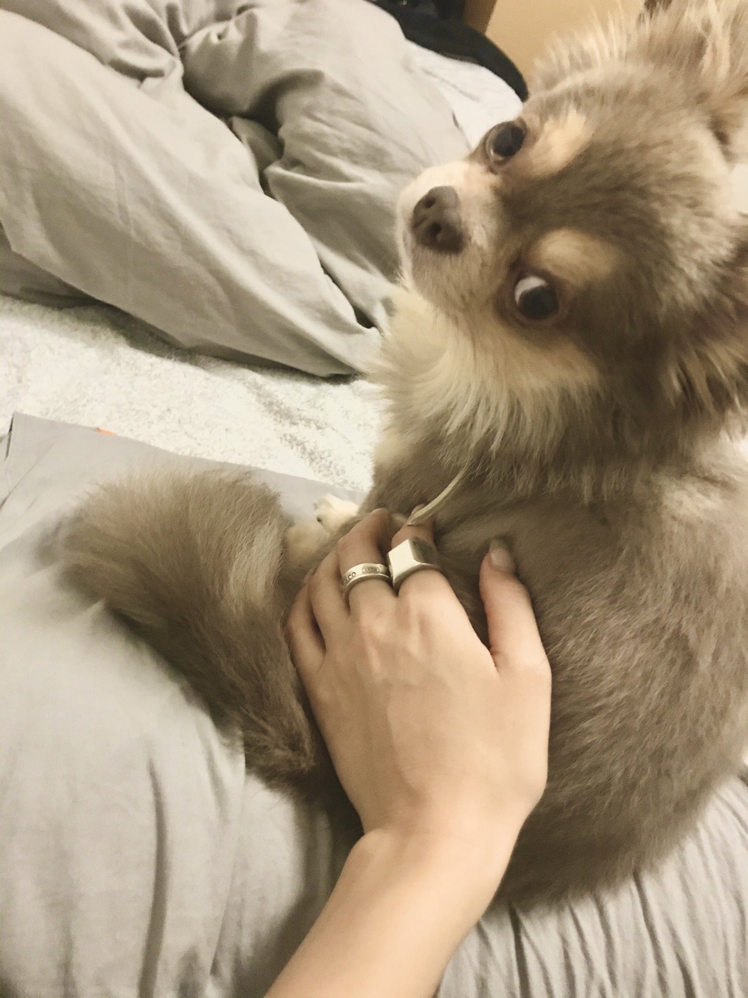 朝は散歩の時間になると、足で私の顔を踏んだり叩いたりして目覚ましより先に起こしてくれます。