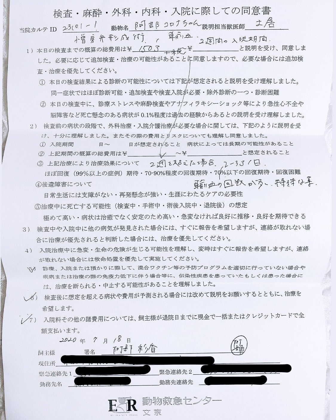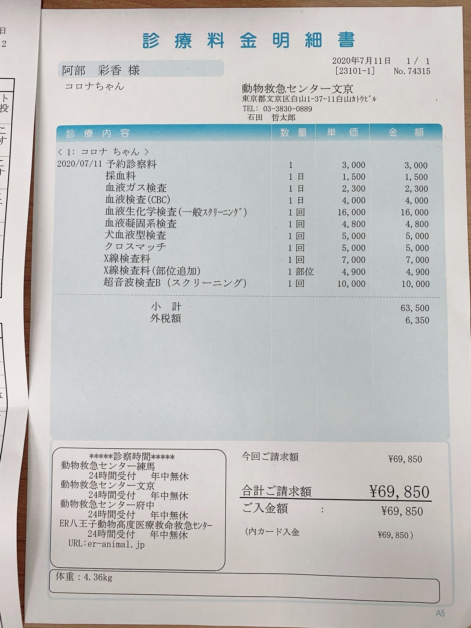 内容としては画像の通り、血液検査、レントゲン検査、各内臓の超音波検査、輸血の適合検査等でした。