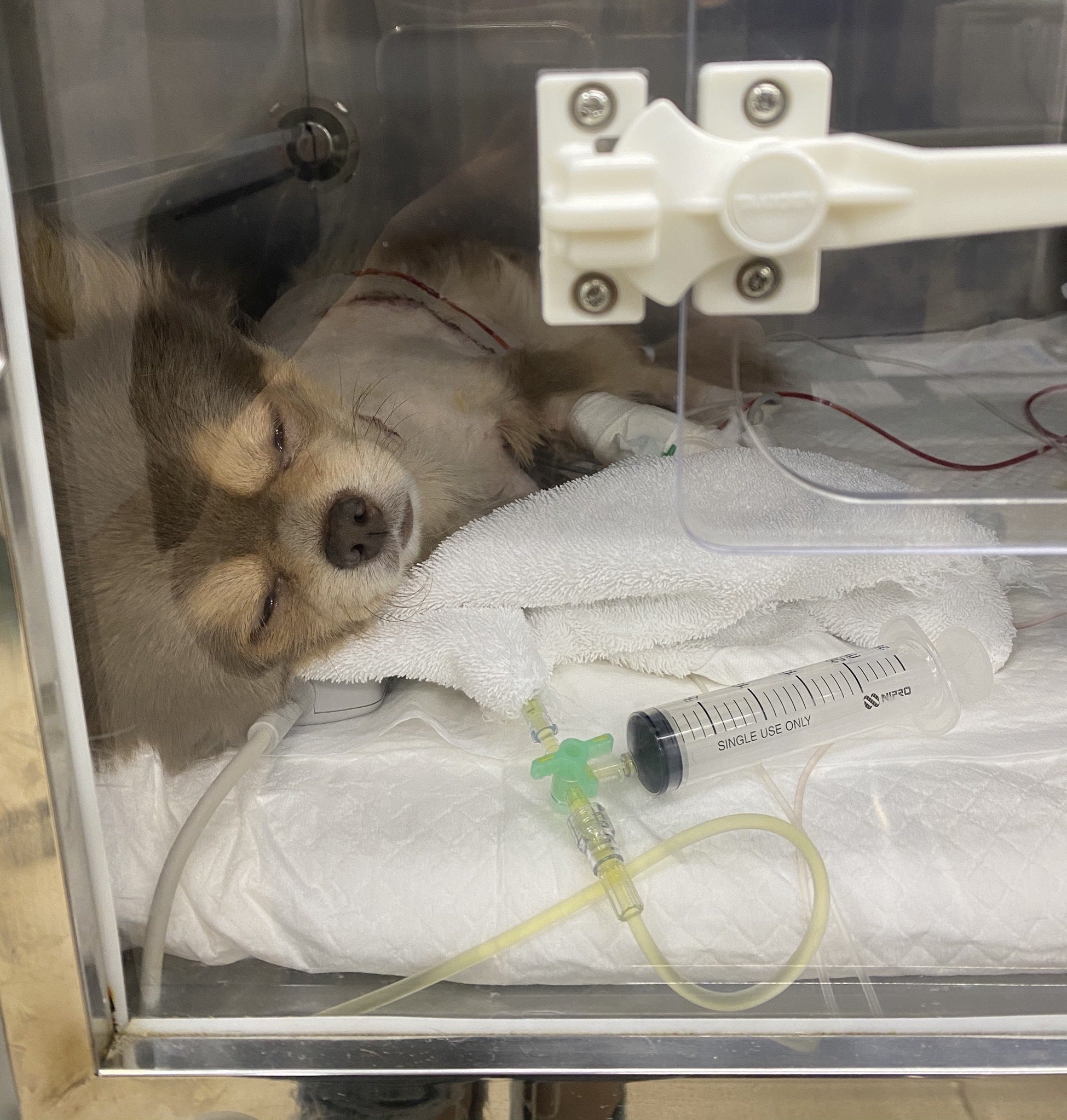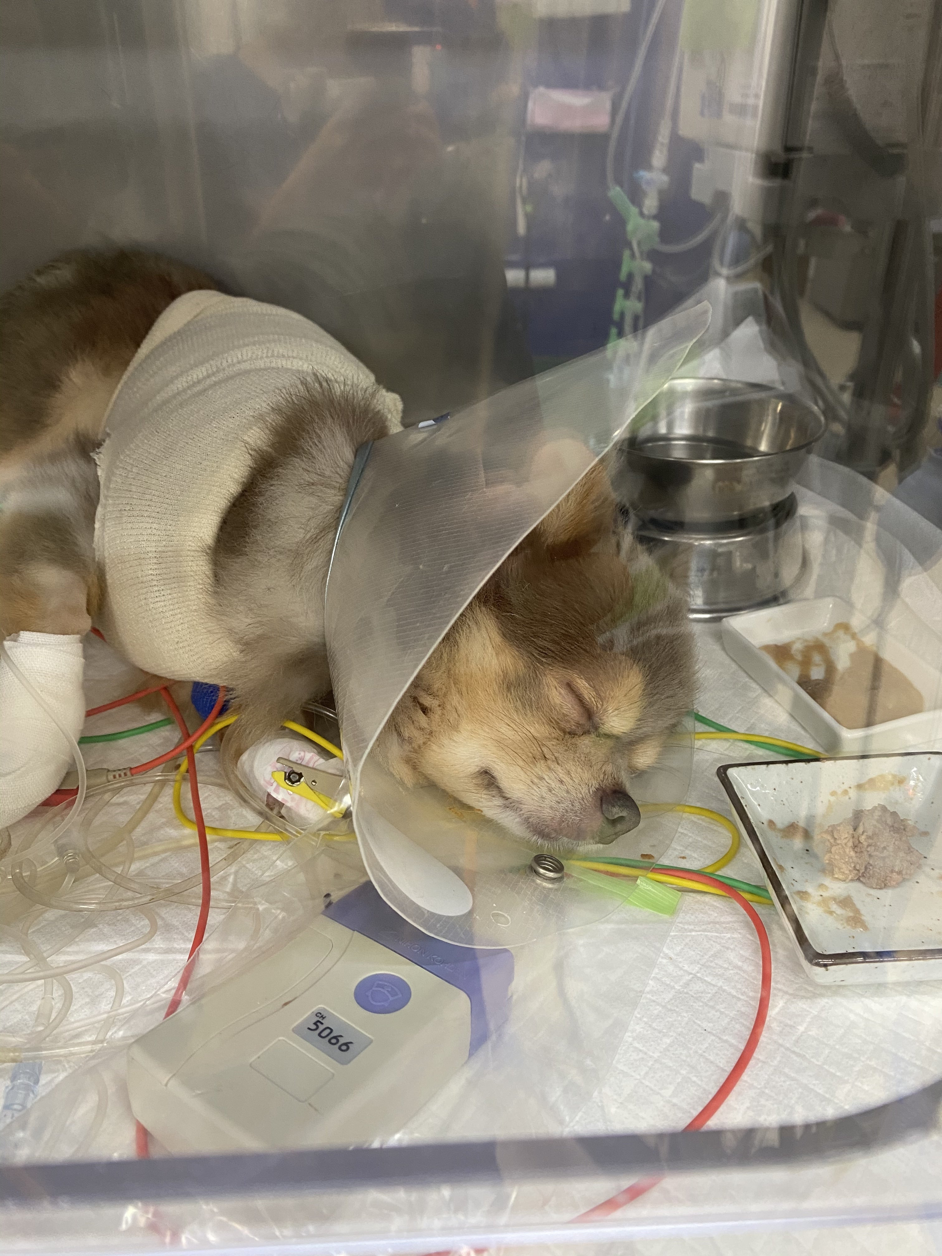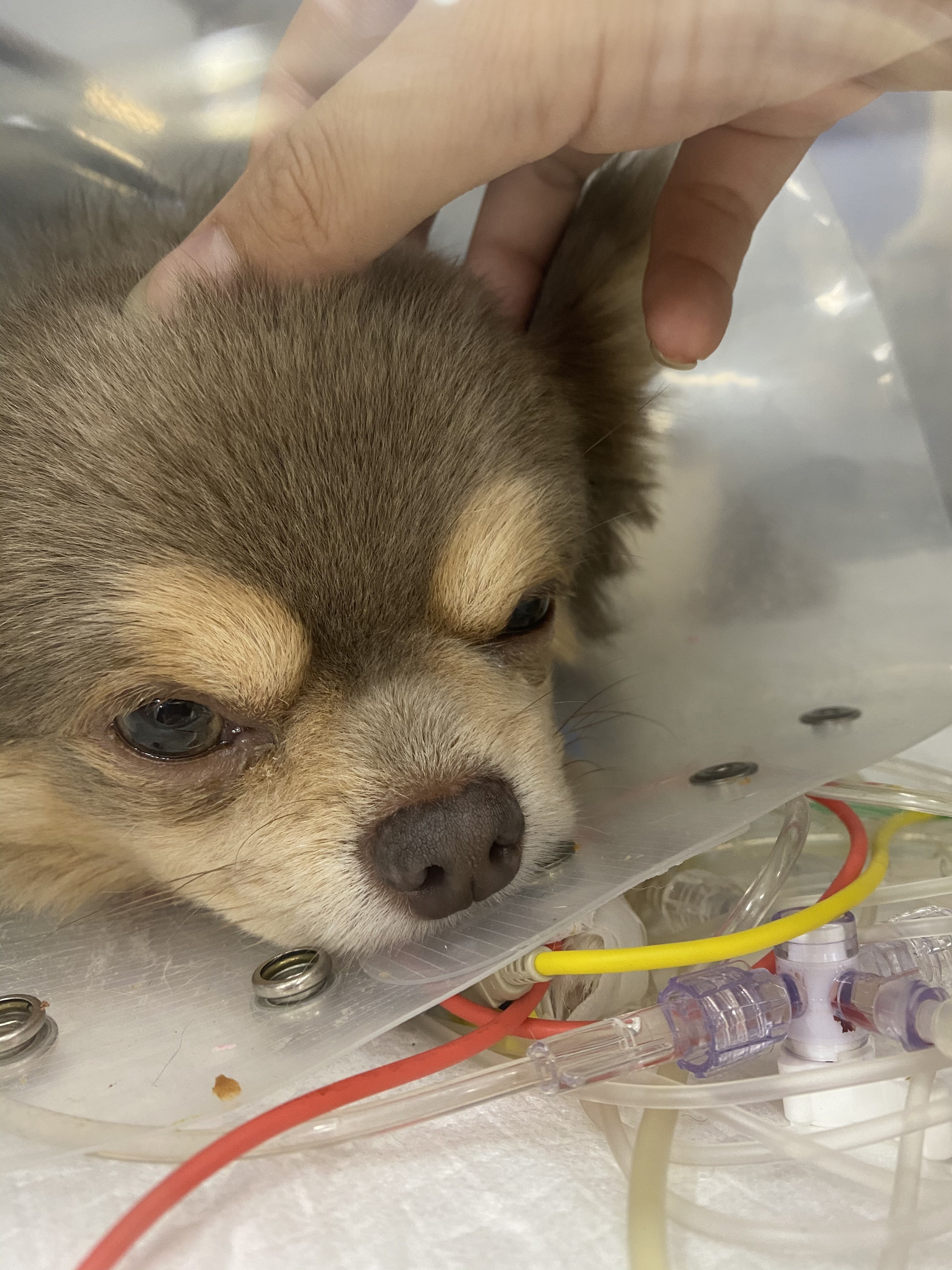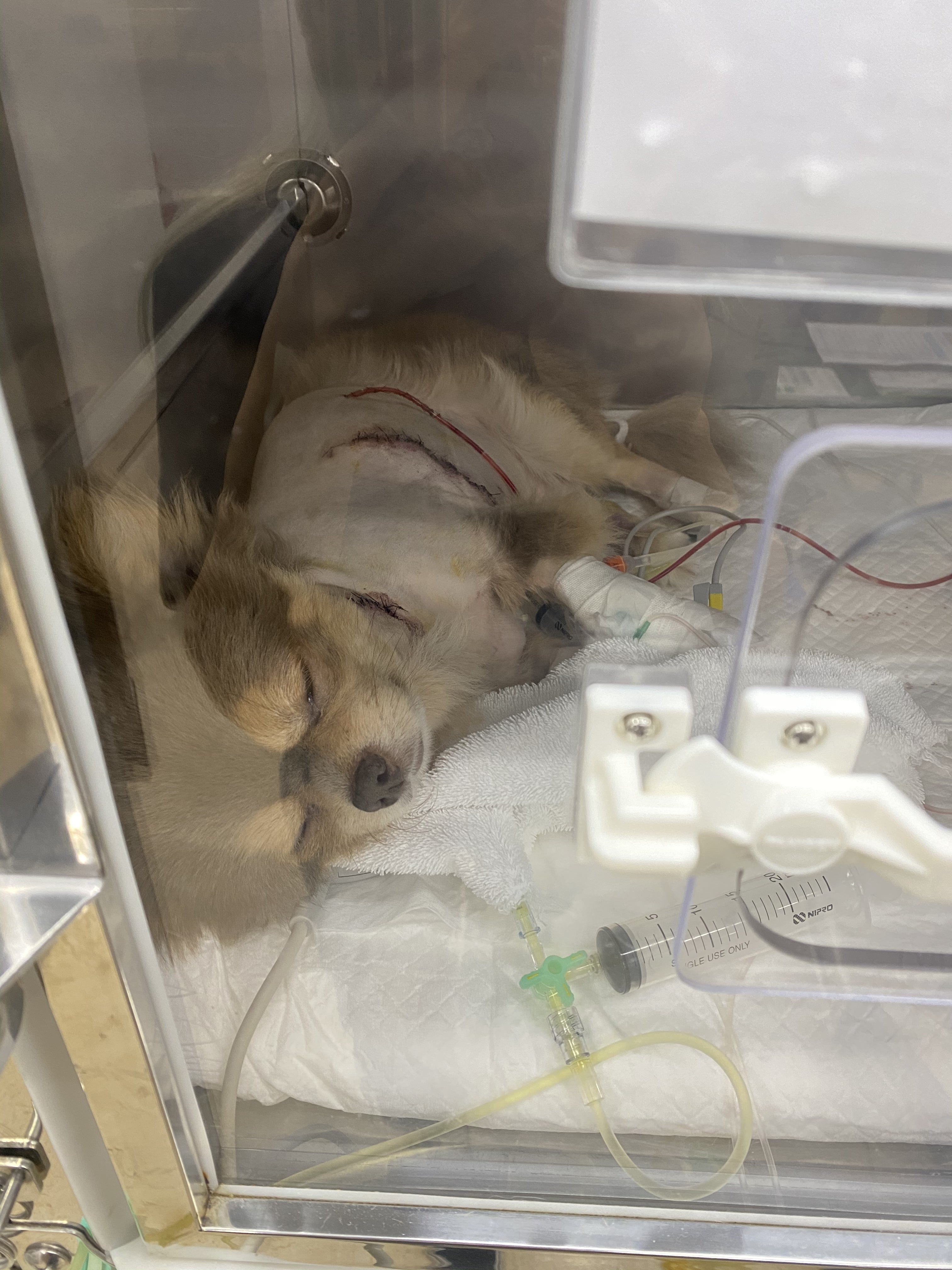 手術直後の麻酔が切れたうつろな状態で酸素室で寝ているこっさんを見て痛々しくもがんばって生き延びてくれて、息をしてくれていて本当によかったと思いました。