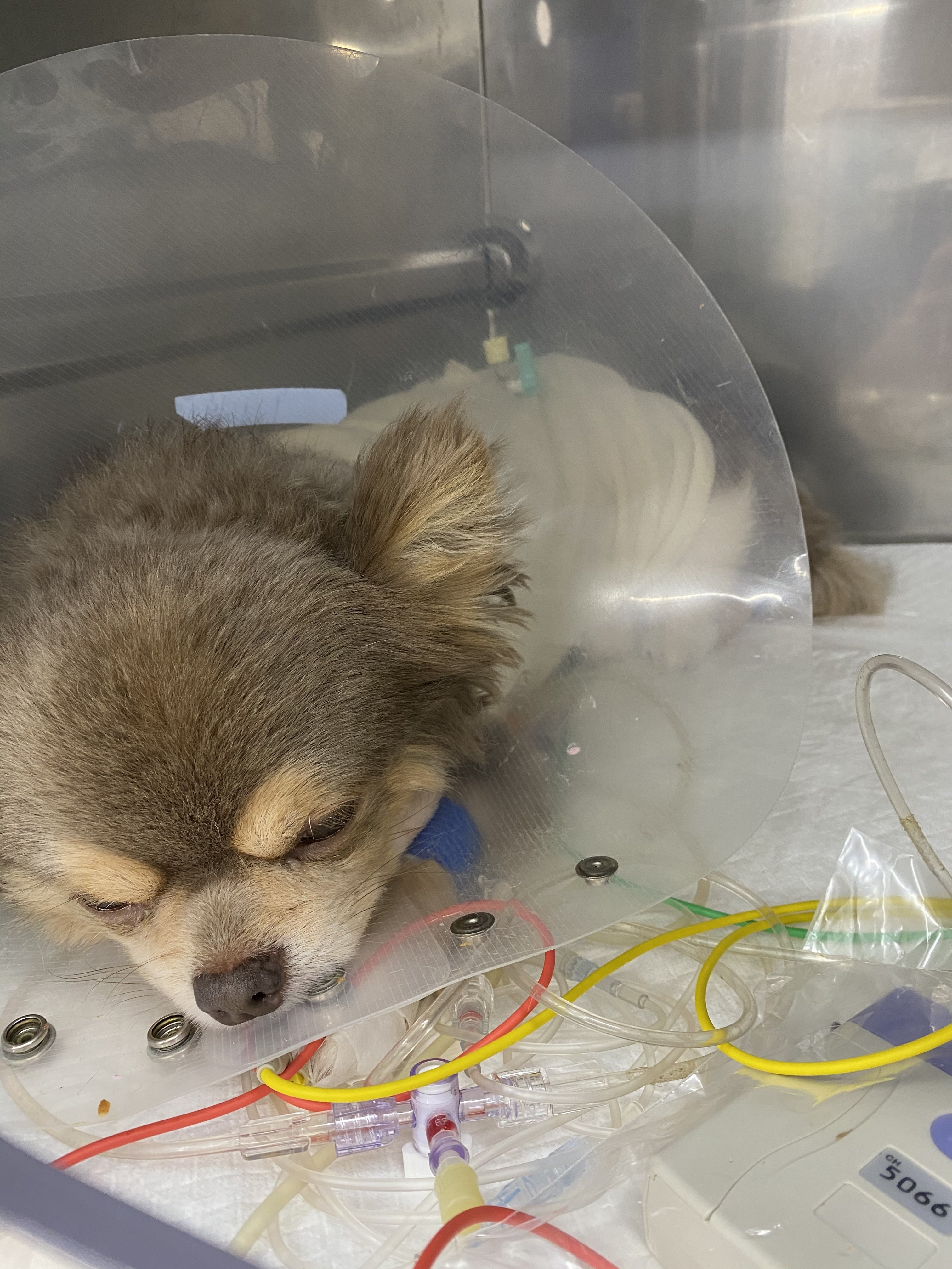 まだ体がだるそうで、お水を飲む為に前足だけで起き上がるのがやっと、4本脚とお腹しっぽと尿管と7本も管が刺さっていて動きづらそうでしたが、横になる体勢を変えたりは出来ていました!