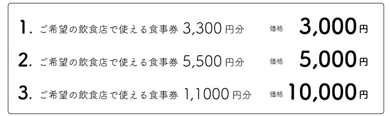 ※コロナの影響により長期休業・閉店などで食事券の使用が出来ない場合も、返金は出来ませんのであらかじめご了承ください。
