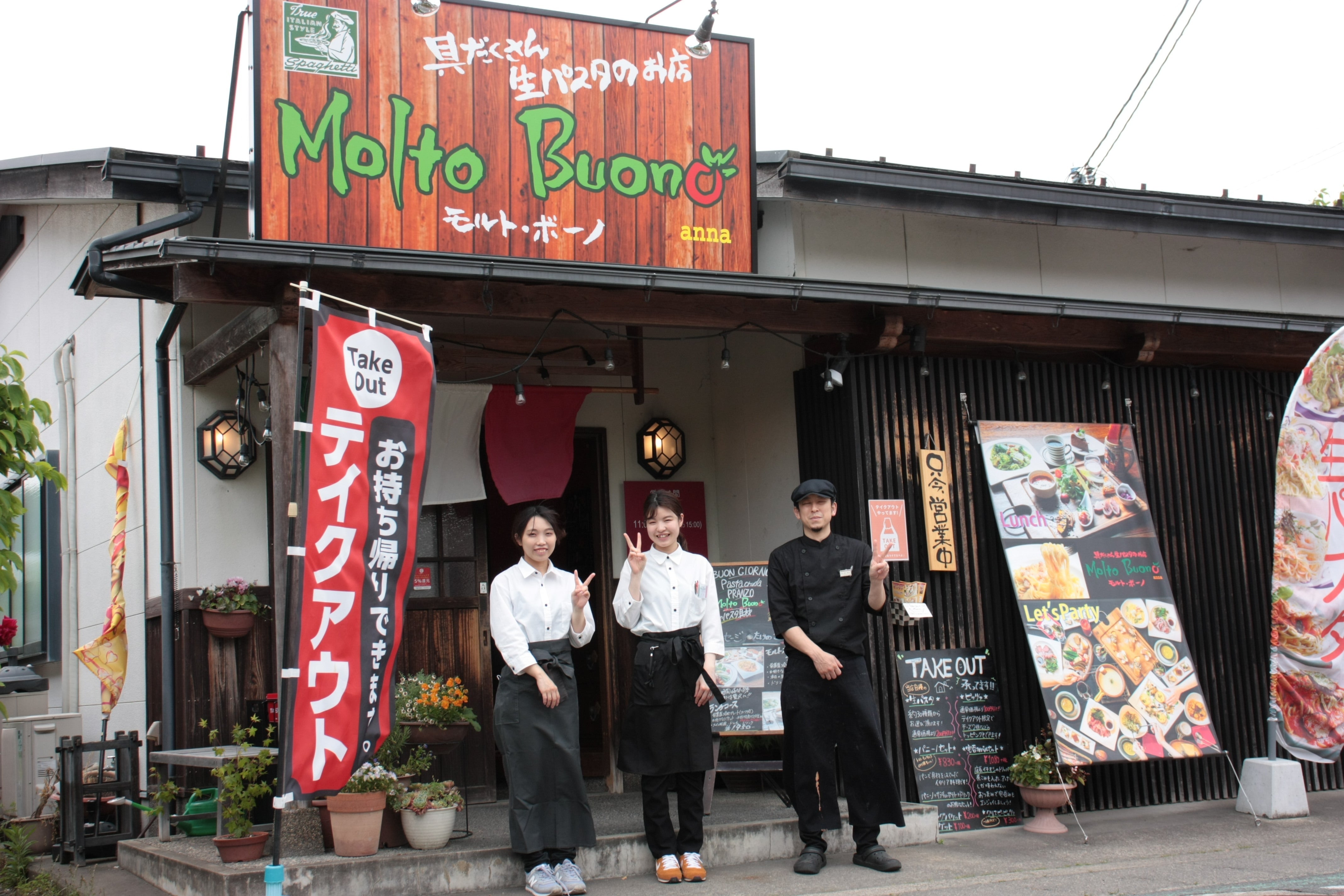大阪では人気のフランチャイズだった「モルトヴォーノ」の生パスタの美味しさに惚れ込んだ社長が、たった一人で2006年11月、福知山市に20坪ほどの小さなお店「モルトヴォーノ・ピッコロ」を開店以来、2008年12月に舞鶴市にモルトヴォーノ・ニーナ、2011年に「盛都」(3月よりモルトボーノ・アンナ)を開店し、地域の方に愛されるお店へと成長してきました。
