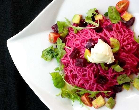 見るからにエネルギッシュなこのカラー!そうです、若返り効果を期待できる抗酸化物質が豊富なビーツの色です。食べてみると、、、あらあら?あっさりして、癖になりそうなパスタです。