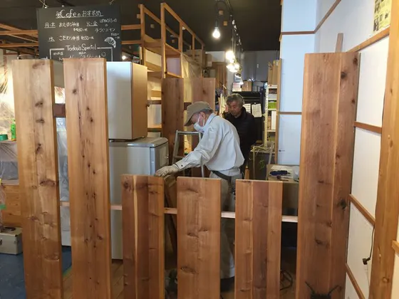 最後の仕事カウンター設置作業。これまで衝立として活用していた丹沢杉を再利用してカウンターを造作してもらっています。かなり細かい調整が、、、。