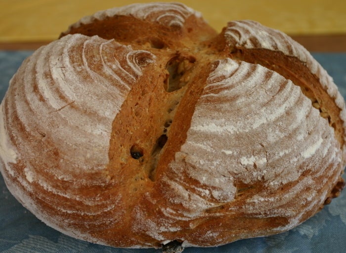 上の天然酵母パンは朝食時にお出しするカンパーニュです。クルミとレーズン入りです。
