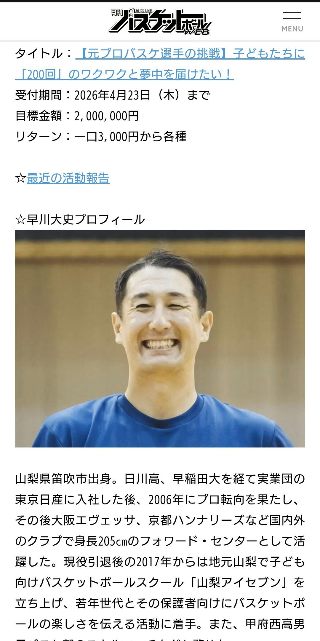 新年度の活動では、保育園や幼稚園などでの無料出張事業開催を、昨年度の139回から200回に増やすことを目標としている。「生まれた環境や経済状況に関わらず、全ての子にワクワクの機会を」という早川の思いとクラウドファンディングの趣旨に賛同する人、あるいは関心を持つ人は下記概要からさらに詳細な情報を確認の上、協力を検討してはいかがだろうか。クラウドファンディング受付プラットフォームの「CAMPFIRE」で早川が掲載している支援受付ページでは、川辺泰三氏(現・神戸ストークスHC)や前田顕蔵氏(前・秋田ノーザンハピネッツHC)らからの応援の言葉も紹介されている。
