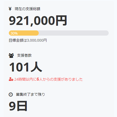 クラウドファンディングの公開期間も残り9日となりましたが、支援者さまが100人を超えました!