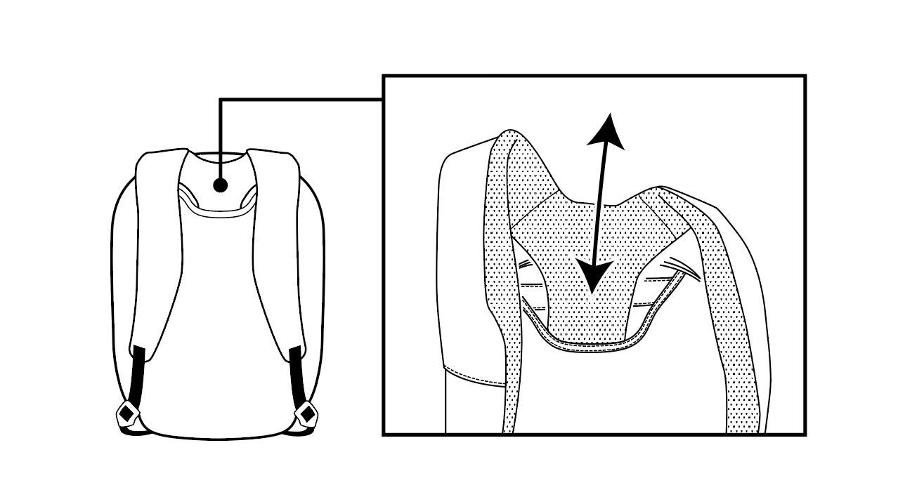 快適にBATENを背負うためには、ショルダーハーネスを最適な長さに調節することが大切です。サスペンション効果を実感する長さはバックパック本体を背中にフィットする位置に調整してください。チェストベルトを締めるとより効果的です。