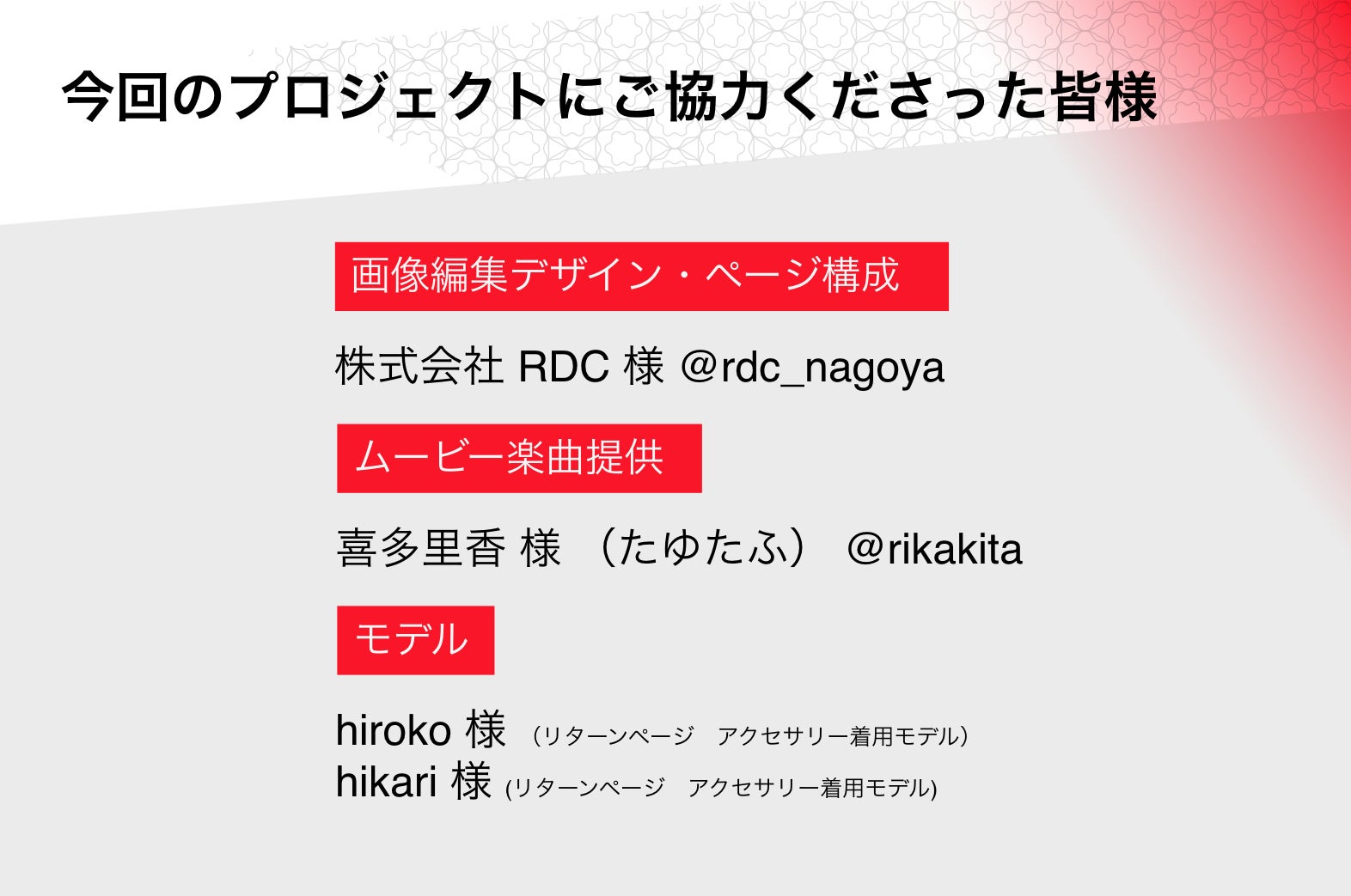 その他、デザインやスライドに使用している楽曲の他、アクセサリーの着用モデルとしてご協力くださった方々、一人一人の温かいお気持ちでこのプロジェクトは作られているのです。